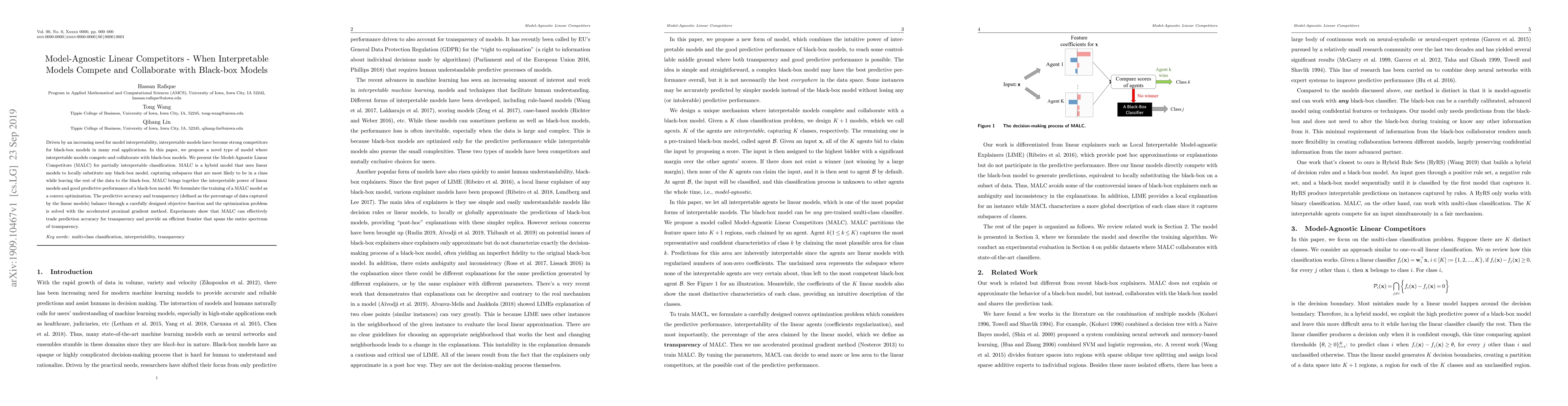 This paper introduces Model-Agnostic Linear Competitors (MALC), a hybrid model that combines interpretable linear models with black-box models to achieve a balance between interpretability and predictive accuracy. MALC optimizes a convex objective function to determine the best trade-off between transparency and accuracy.