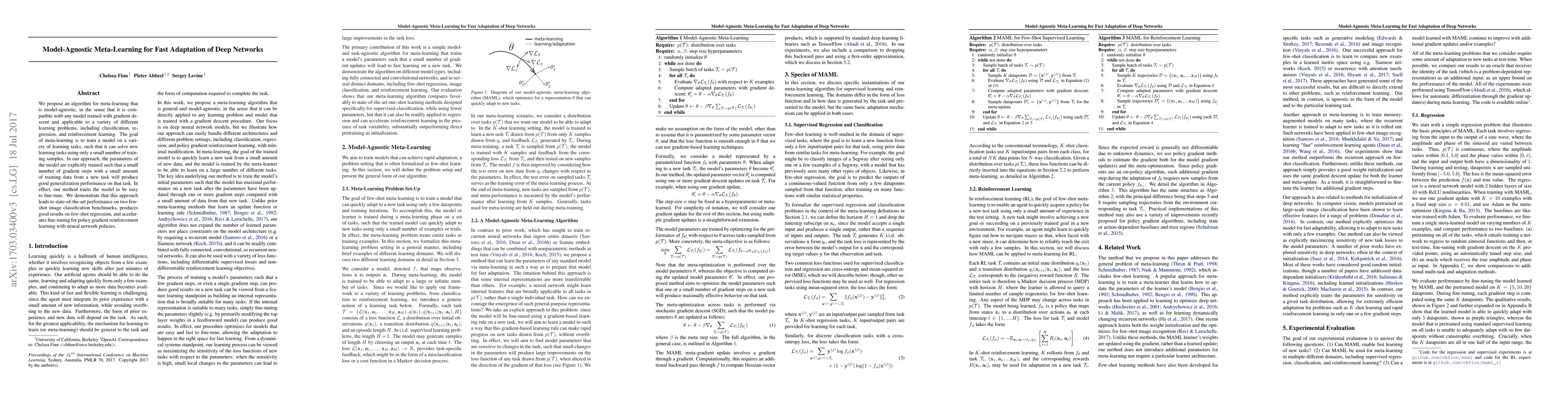 We propose an algorithm for meta-learning that is model-agnostic, in the sense that it is compatible with any model trained with gradient descent and applicable to a variety of different learning problems, including classification, regression, and reinforcement learning. The goal of meta-learning is to train a model on a variety of learning tasks, such that it can solve new learning tasks using only a small number of training samples. In our approach, the parameters of the model are explicitly trained such that a small number of gradient steps with a small amount of training data from a new task will produce good generalization performance on that task. In effect, our method trains the model to be easy to fine-tune. We demonstrate that this approach leads to state-of-the-art performance on two few-shot image classification benchmarks, produces good results on few-shot regression, and accelerates fine-tuning for policy gradient reinforcement learning with neural network policies.