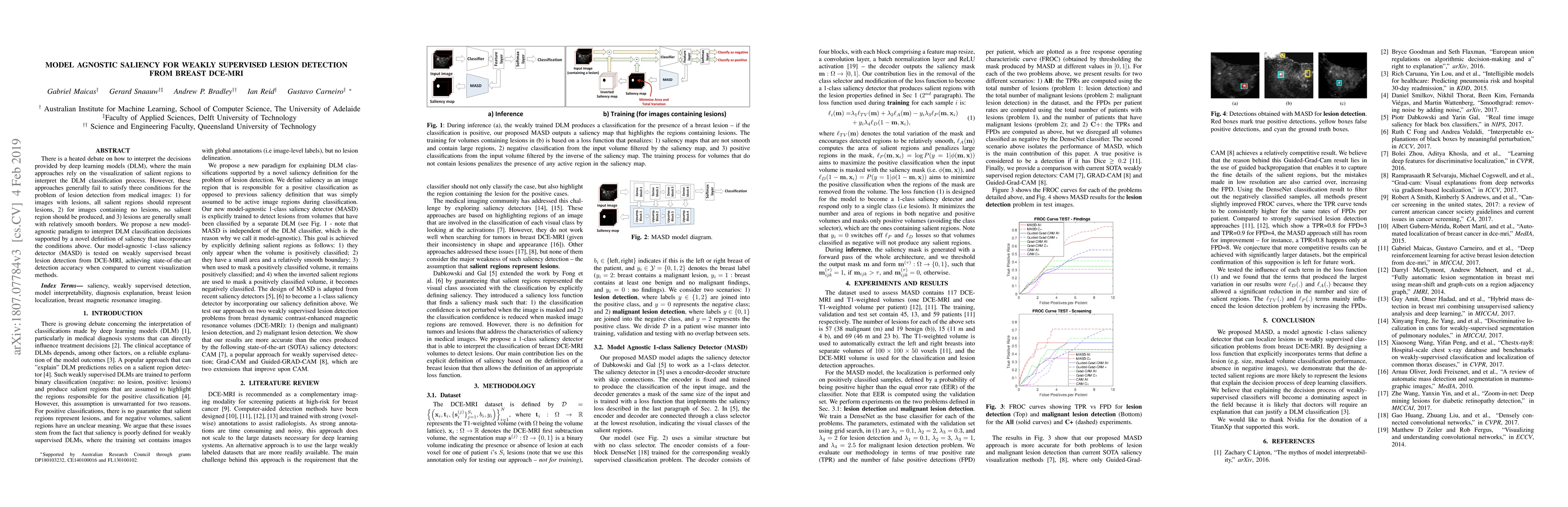 There is a heated debate on how to interpret the decisions provided by deep learning models (DLM), where the main approaches rely on the visualization of salient regions to interpret the DLM classification process. However, these approaches generally fail to satisfy three conditions for the problem of lesion detection from medical images: 1) for images with lesions, all salient regions should represent lesions, 2) for images containing no lesions, no salient region should be produced,and 3) lesions are generally small with relatively smooth borders. We propose a new model-agnostic paradigm to interpret DLM classification decisions supported by a novel definition of saliency that incorporates the conditions above. Our model-agnostic 1-class saliency detector (MASD) is tested on weakly supervised breast lesion detection from DCE-MRI, achieving state-of-the-art detection accuracy when compared to current visualization methods.