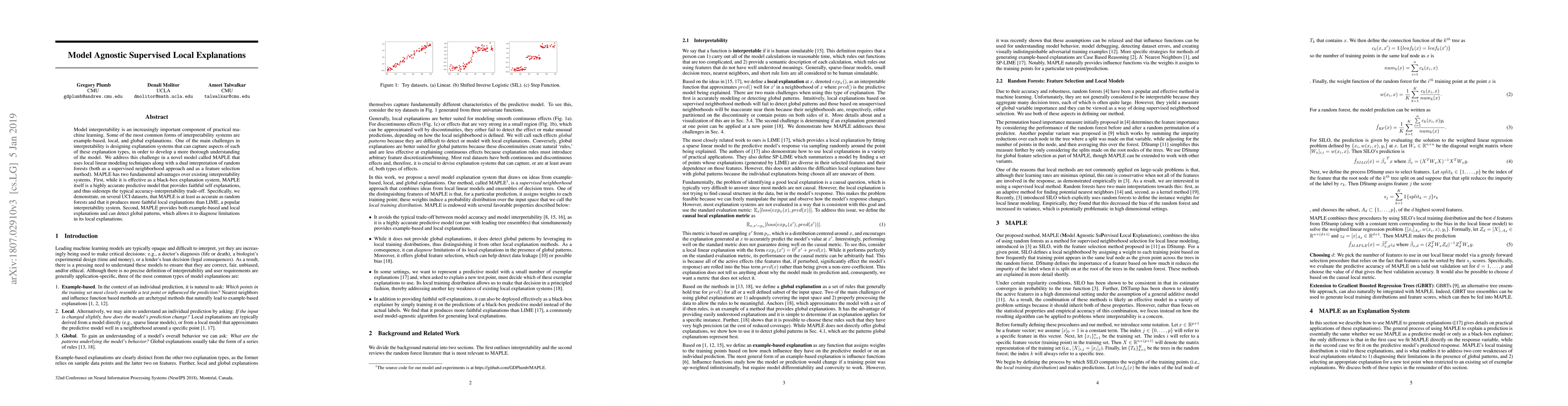 Model interpretability is an increasingly important component of practical machine learning. Some of the most common forms of interpretability systems are example-based, local, and global explanations. One of the main challenges in interpretability is designing explanation systems that can capture aspects of each of these explanation types, in order to develop a more thorough understanding of the model. We address this challenge in a novel model called MAPLE that uses local linear modeling techniques along with a dual interpretation of random forests (both as a supervised neighborhood approach and as a feature selection method). MAPLE has two fundamental advantages over existing interpretability systems. First, while it is effective as a black-box explanation system, MAPLE itself is a highly accurate predictive model that provides faithful self explanations, and thus sidesteps the typical accuracy-interpretability trade-off. Specifically, we demonstrate, on several UCI datasets, that MAPLE is at least as accurate as random forests and that it produces more faithful local explanations than LIME, a popular interpretability system. Second, MAPLE provides both example-based and local explanations and can detect global patterns, which allows it to diagnose limitations in its local explanations.