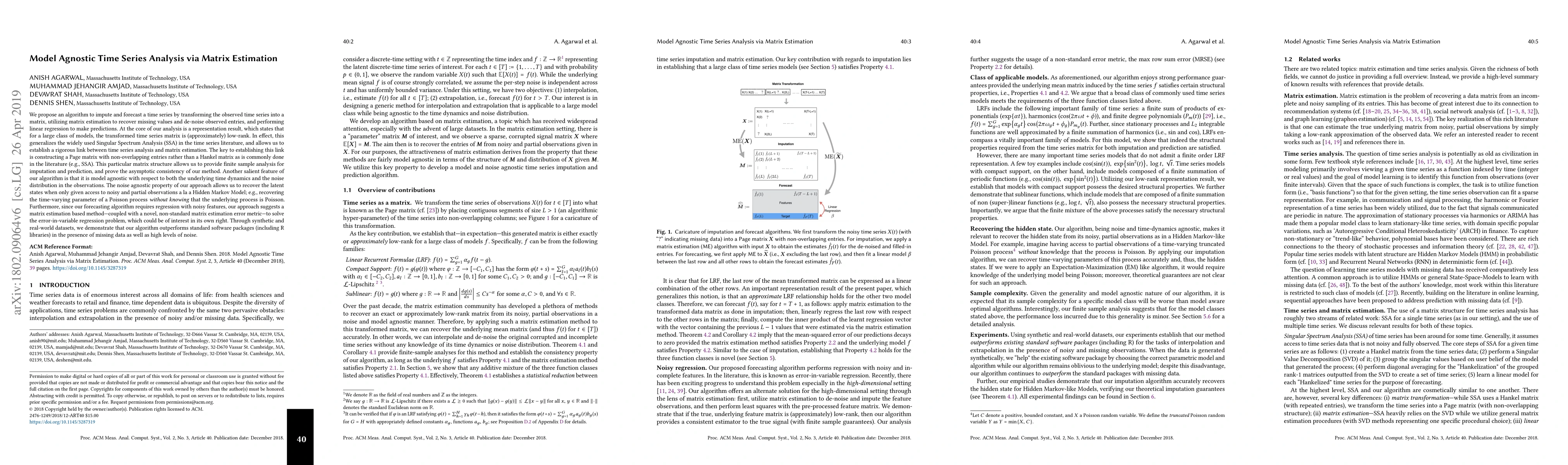 This paper proposes a model agnostic algorithm for time series imputation and forecasting by transforming the series into a matrix, utilizing matrix estimation for recovery and denoising, and linear regression for predictions. The method leverages a novel matrix structure to achieve finite sample analysis and asymptotic consistency, outperforming standard methods in synthetic and real-world datasets.