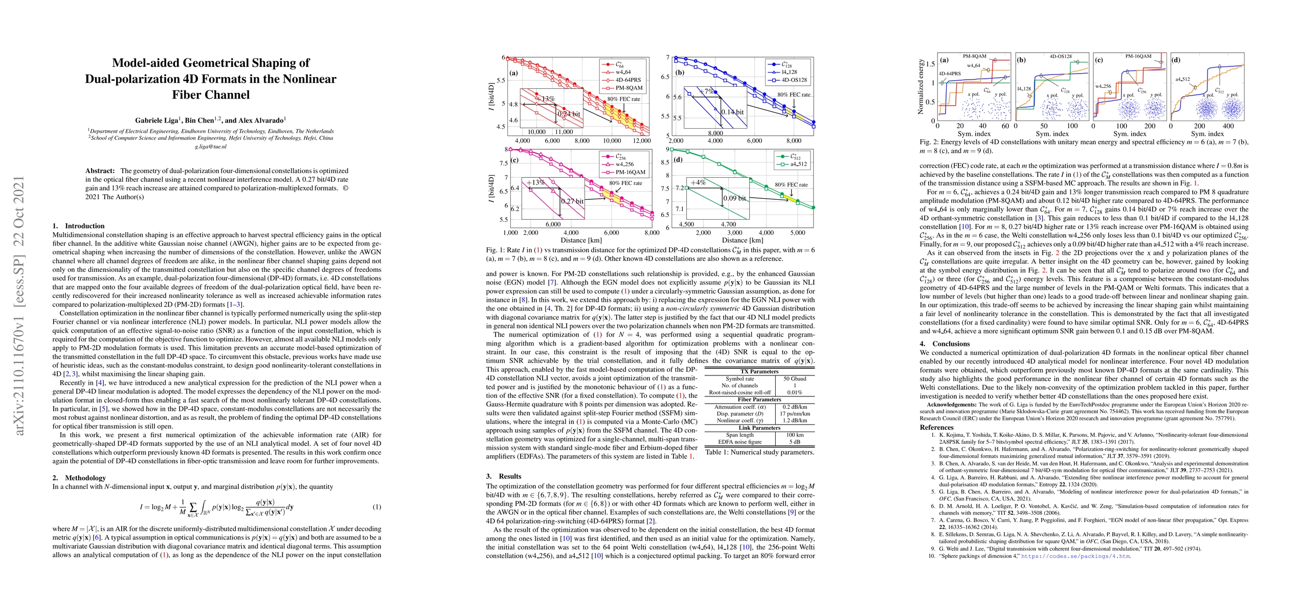 This paper optimizes the geometry of dual-polarization four-dimensional constellations in optical fiber channels using a nonlinear interference model, achieving a 0.27 bit/4D rate gain and a 13% increase in transmission reach compared to traditional polarization-multiplexed formats.
