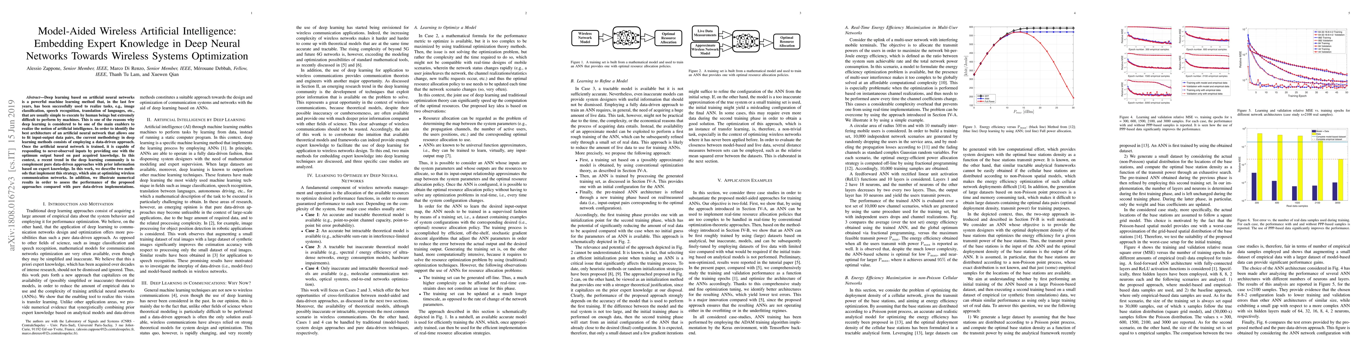 Deep learning based on artificial neural networks is a powerful machine learning method that, in the last few years, has been successfully used to realize tasks, e.g., image classification, speech recognition, translation of languages, etc., that are usually simple to execute by human beings but extremely difficult to perform by machines. This is one of the reasons why deep learning is considered to be one of the main enablers to realize the notion of artificial intelligence. In order to identify the best architecture of an artificial neural network that allows one to fit input-output data pairs, the current methodology in deep learning methods consists of employing a data-driven approach. Once the artificial neural network is trained, it is capable of responding to never-observed inputs by providing the optimum output based on past acquired knowledge. In this context, a recent trend in the deep learning community is to complement pure data-driven approaches with prior information based on expert knowledge. In this work, we describe two methods that implement this strategy, which aim at optimizing wireless communication networks. In addition, we illustrate numerical results in order to assess the performance of the proposed approaches compared with pure data-driven implementations.