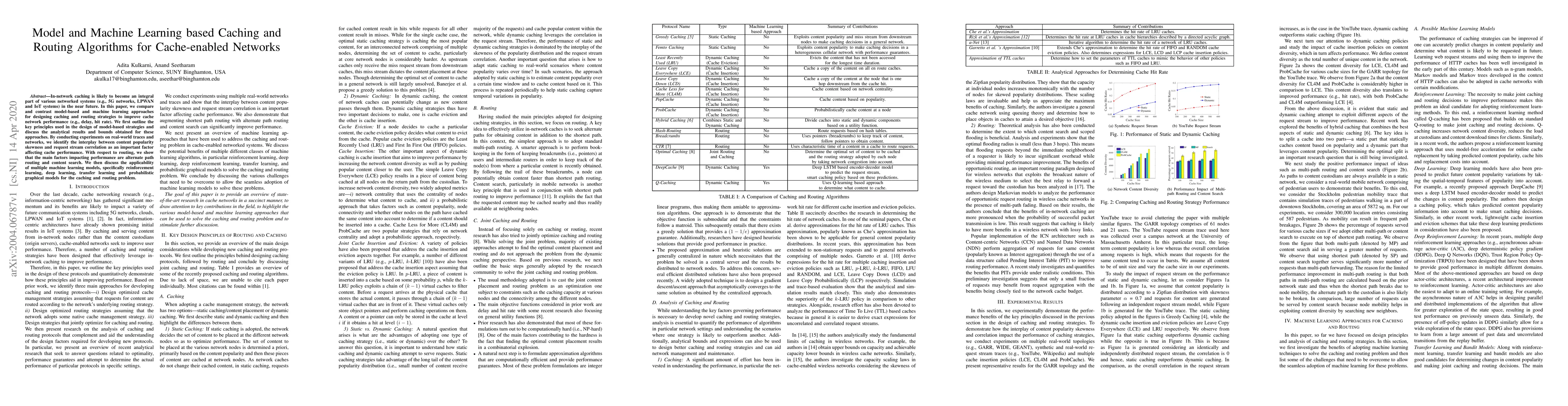 This paper compares model-based and machine learning approaches for caching and routing in cache-enabled networks, highlighting the impact of content popularity skewness and request stream correlation on performance. It also explores the use of reinforcement learning, deep learning, transfer learning, and probabilistic graphical models to optimize these strategies.