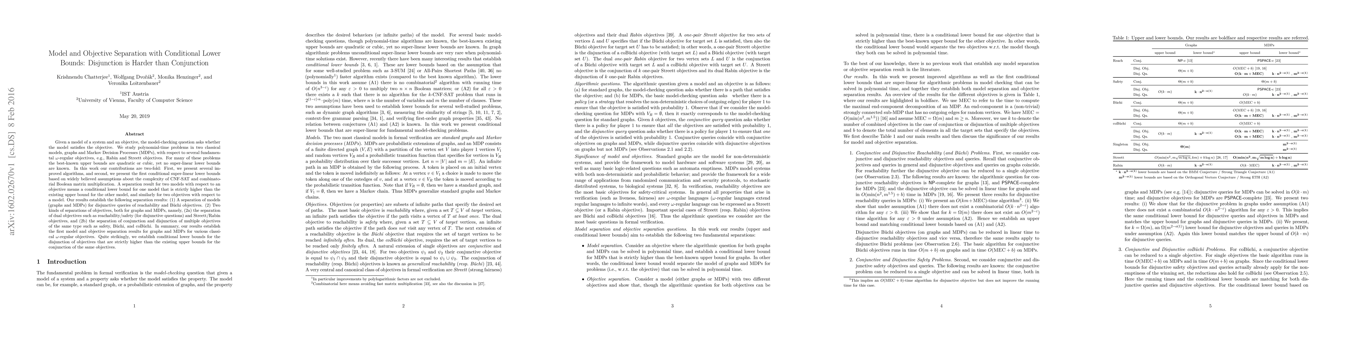 Given a model of a system and an objective, the model-checking question asks whether the model satisfies the objective. We study polynomial-time problems in two classical models, graphs and Markov Decision Processes (MDPs), with respect to several fundamental $\omega$-regular objectives, e.g., Rabin and Streett objectives. For many of these problems the best-known upper bounds are quadratic or cubic, yet no super-linear lower bounds are known. In this work our contributions are two-fold: First, we present several improved algorithms, and second, we present the first conditional super-linear lower bounds based on widely believed assumptions about the complexity of CNF-SAT and combinatorial Boolean matrix multiplication. A separation result for two models with respect to an objective means a conditional lower bound for one model that is strictly higher than the existing upper bound for the other model, and similarly for two objectives with respect to a model. Our results establish the following separation results: (1) A separation of models (graphs and MDPs) for disjunctive queries of reachability and B\"uchi objectives. (2) Two kinds of separations of objectives, both for graphs and MDPs, namely, (2a) the separation of dual objectives such as reachability/safety (for disjunctive questions) and Streett/Rabin objectives, and (2b) the separation of conjunction and disjunction of multiple objectives of the same type such as safety, B\"uchi, and coB\"uchi. In summary, our results establish the first model and objective separation results for graphs and MDPs for various classical $\omega$-regular objectives. Quite strikingly, we establish conditional lower bounds for the disjunction of objectives that are strictly higher than the existing upper bounds for the conjunction of the same objectives.