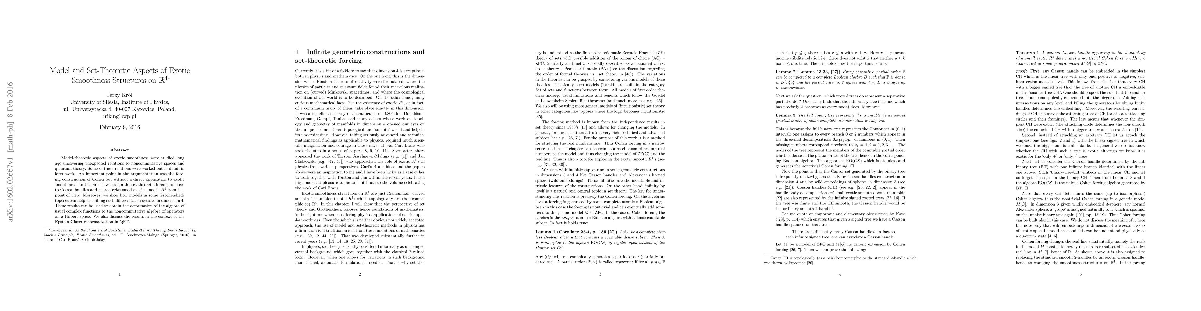 Model-theoretic aspects of exotic smoothness were studied long ago uncovering unexpected relations to noncommutative spaces and quantum theory. Some of these relations were worked out in detail in later work. An important point in the argumentation was the forcing construction of Cohen but without a direct application to exotic smoothness. In this article we assign the set-theoretic forcing on trees to Casson handles and characterize small exotic smooth $R^4$ from this point of view. Moreover, we show how models in some Grothendieck toposes can help describing such differential structures in dimension 4. These results can be used to obtain the deformation of the algebra of usual complex functions to the noncommutative algebra of operators on a Hilbert space. We also discuss the results in the context of the Epstein-Glaser renormalization in QFT.