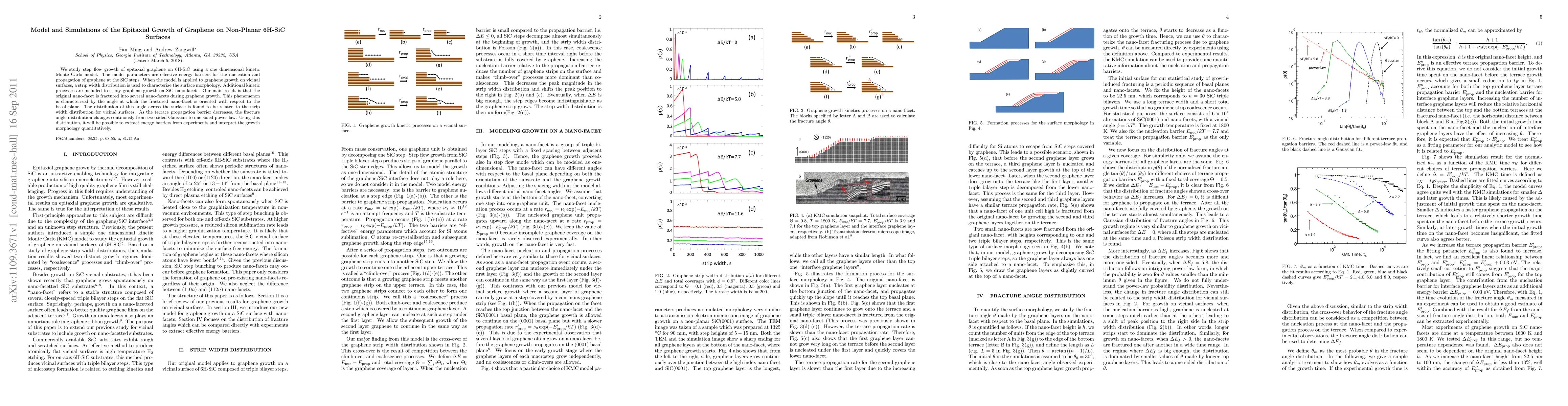 We study step flow growth of epitaxial graphene on 6H-SiC using a one dimensional kinetic Monte Carlo model. The model parameters are effective energy barriers for the nucleation and propagation of graphene at the SiC steps. When the model is applied to graphene growth on vicinal surfaces, a strip width distribution is used to characterize the surface morphology. Additional kinetic processes are included to study graphene growth on SiC nano-facets. Our main result is that the original nano-facet is fractured into several nano-facets during graphene growth. This phenomenon is characterized by the angle at which the fractured nano-facet is oriented with respect to the basal plane. The distribution of this angle across the surface is found to be related to the strip width distribution for vicinal surfaces. As the terrace propagation barrier decreases, the fracture angle distribution changes continously from two-sided Gaussian to one-sided power-law. Using this distribution, it will be possible to extract energy barriers from experiments and interpret the growth morphology quantitatively.