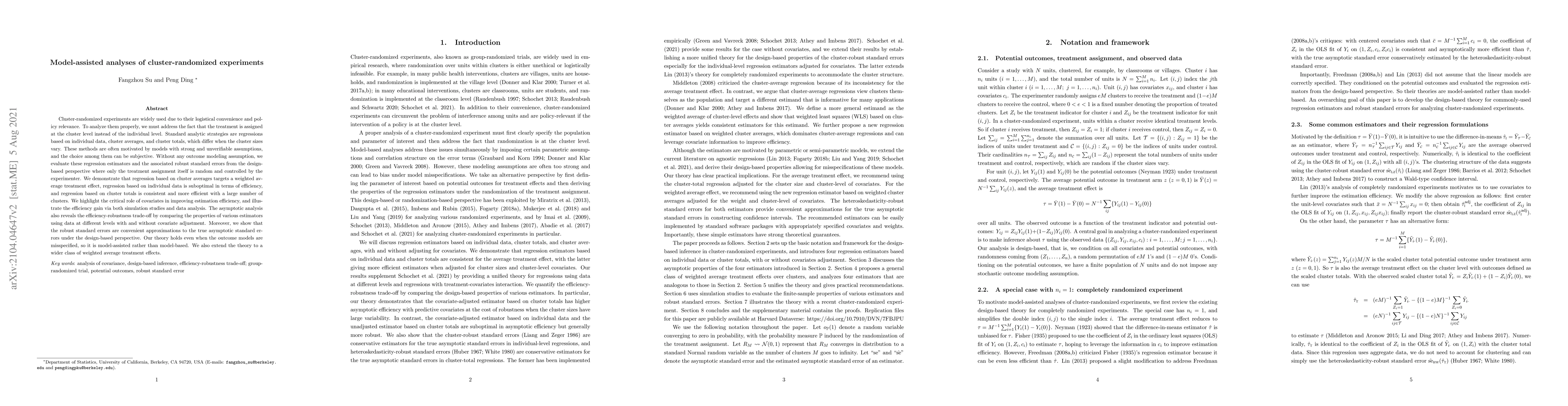 This paper evaluates different regression methods for analyzing cluster-randomized experiments, demonstrating that regression on cluster averages targets a weighted average treatment effect, while individual data regression is inefficient and cluster totals regression is consistent and efficient with many clusters. The study emphasizes the importance of covariates for efficiency and shows robust standard errors as good approximations under design-based perspectives.