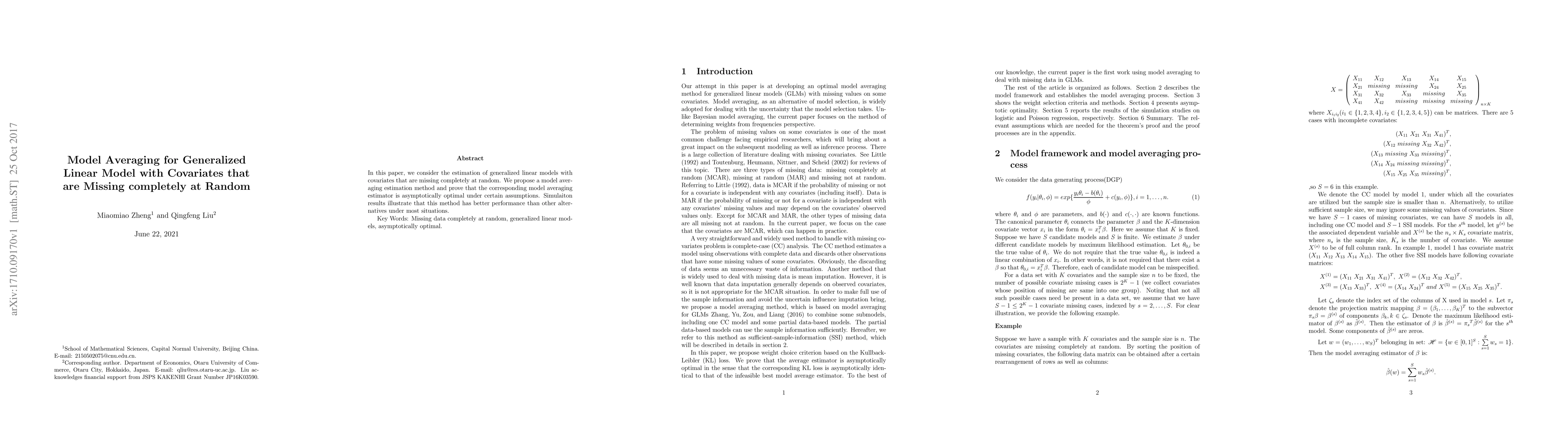 This paper proposes a model averaging method for estimating generalized linear models with covariates that are missing completely at random. The authors demonstrate that their method is asymptotically optimal and outperform other alternatives in simulation studies.
