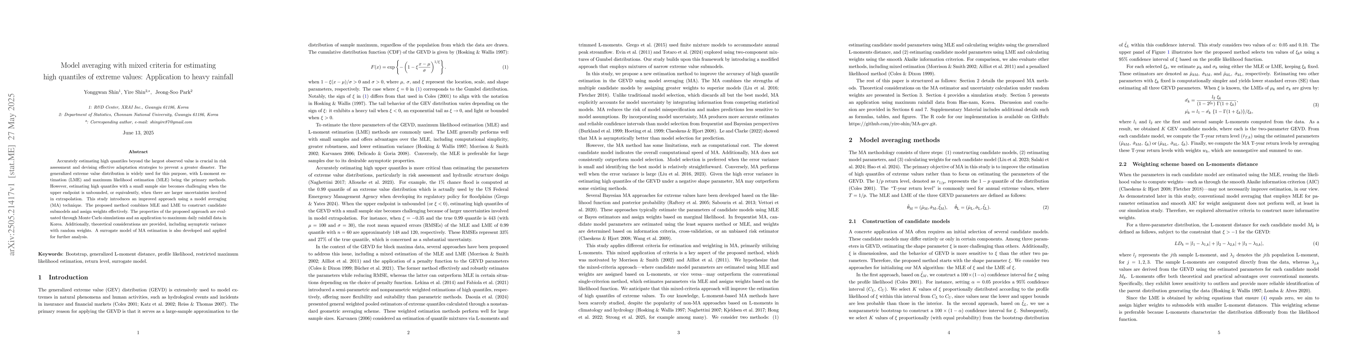 The research proposes a model averaging (MA) technique that combines maximum likelihood estimation (MLE) and L-moment estimation (LME) to construct candidate submodels and assign weights for estimating high quantiles of extreme values, particularly for heavy rainfall data with small sample sizes.