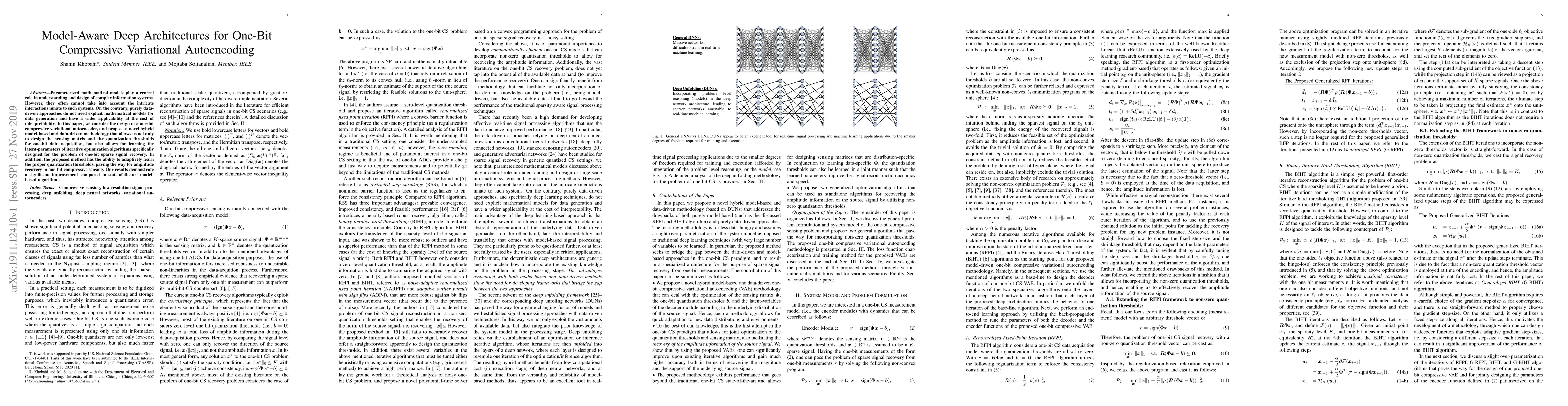 This paper introduces a hybrid model-based and data-driven method for designing one-bit compressive variational autoencoders. It allows for learning optimal sensing matrices, quantization thresholds, and latent parameters for sparse signal recovery, showing significant improvement over existing model-based algorithms.