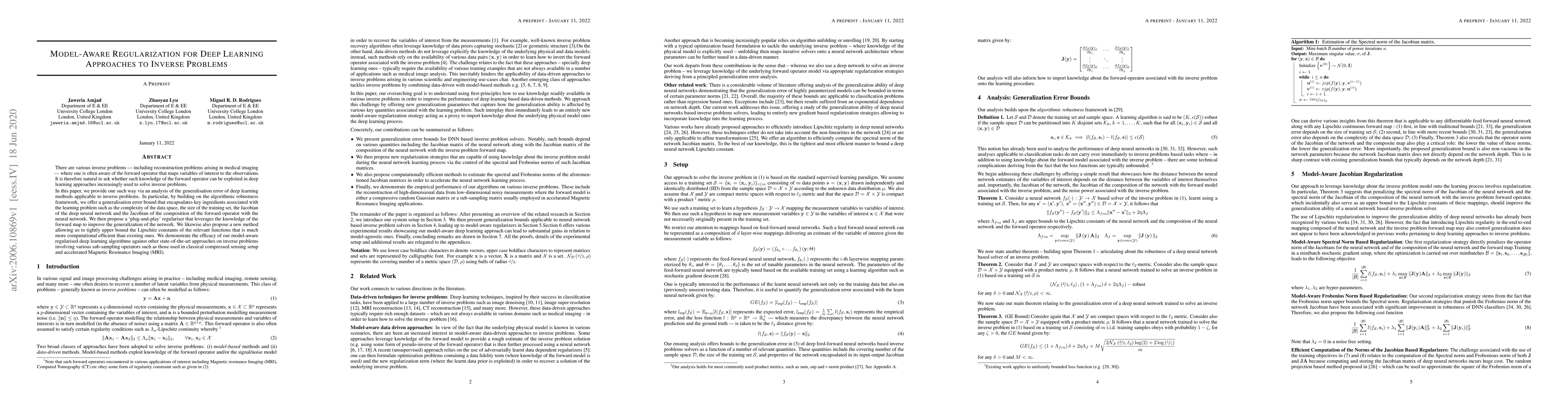 This paper proposes a model-aware regularization technique to improve the generalization of deep learning methods for solving inverse problems, leveraging knowledge of the forward operator. It introduces a computationally efficient method for bounding Lipschitz constants and demonstrates its effectiveness on medical imaging tasks like compressed sensing and MRI.