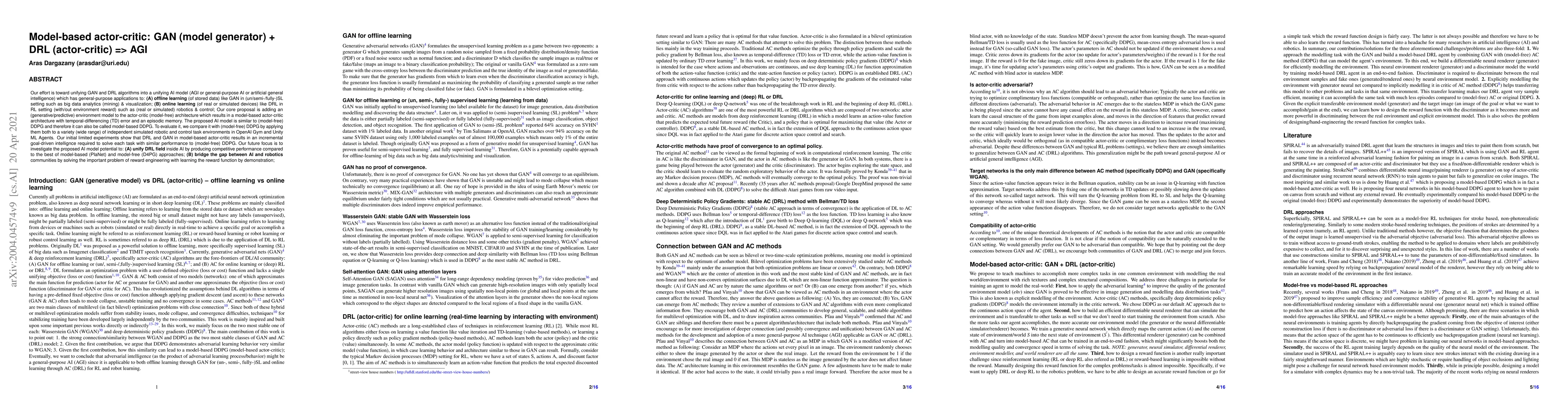 Our effort is toward unifying GAN and DRL algorithms into a unifying AI model (AGI or general-purpose AI or artificial general intelligence which has general-purpose applications to: (A) offline learning (of stored data) like GAN in (un/semi-/fully-)SL setting such as big data analytics (mining) and visualization; (B) online learning (of real or simulated devices) like DRL in RL setting (with/out environment reward) such as (real or simulated) robotics and control; Our core proposal is adding an (generative/predictive) environment model to the actor-critic (model-free) architecture which results in a model-based actor-critic architecture with temporal-differencing (TD) error and an episodic memory. The proposed AI model is similar to (model-free) DDPG and therefore it's called model-based DDPG. To evaluate it, we compare it with (model-free) DDPG by applying them both to a variety (wide range) of independent simulated robotic and control task environments in OpenAI Gym and Unity Agents. Our initial limited experiments show that DRL and GAN in model-based actor-critic results in an incremental goal-driven intellignce required to solve each task with similar performance to (model-free) DDPG. Our future focus is to investigate the proposed AI model potential to: (A) unify DRL field inside AI by producing competitive performance compared to the best of model-based (PlaNet) and model-free (D4PG) approaches; (B) bridge the gap between AI and robotics communities by solving the important problem of reward engineering with learning the reward function by demonstration.