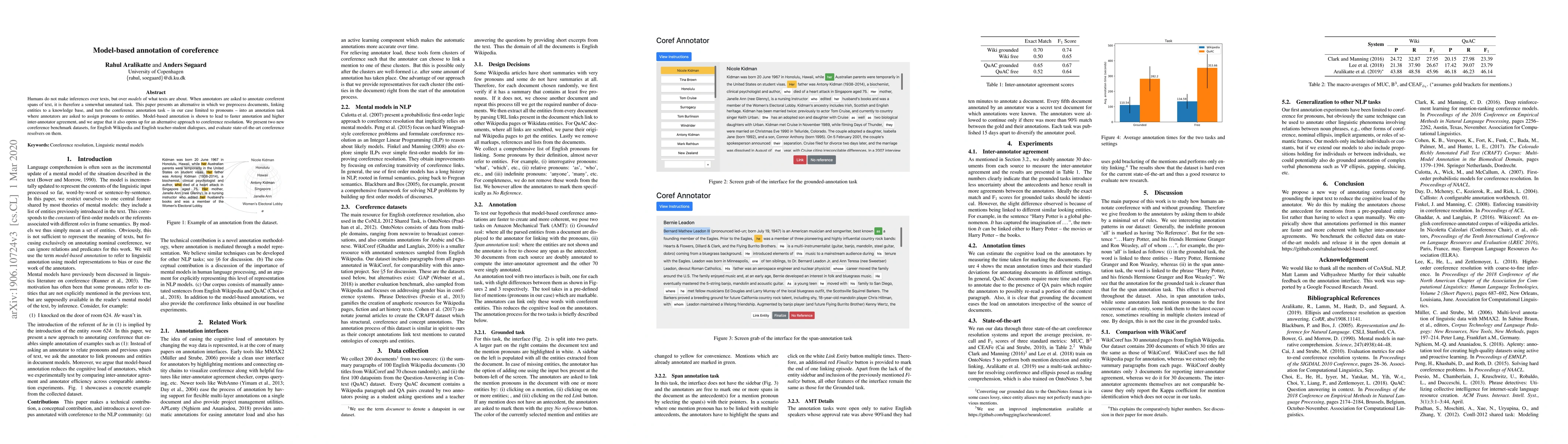 This paper proposes a model-based approach to coreference annotation, where entities are linked to a knowledge base, transforming the task into assigning pronouns to entities. This method results in faster annotation and higher inter-annotator agreement, and it introduces two new benchmark datasets for evaluation.