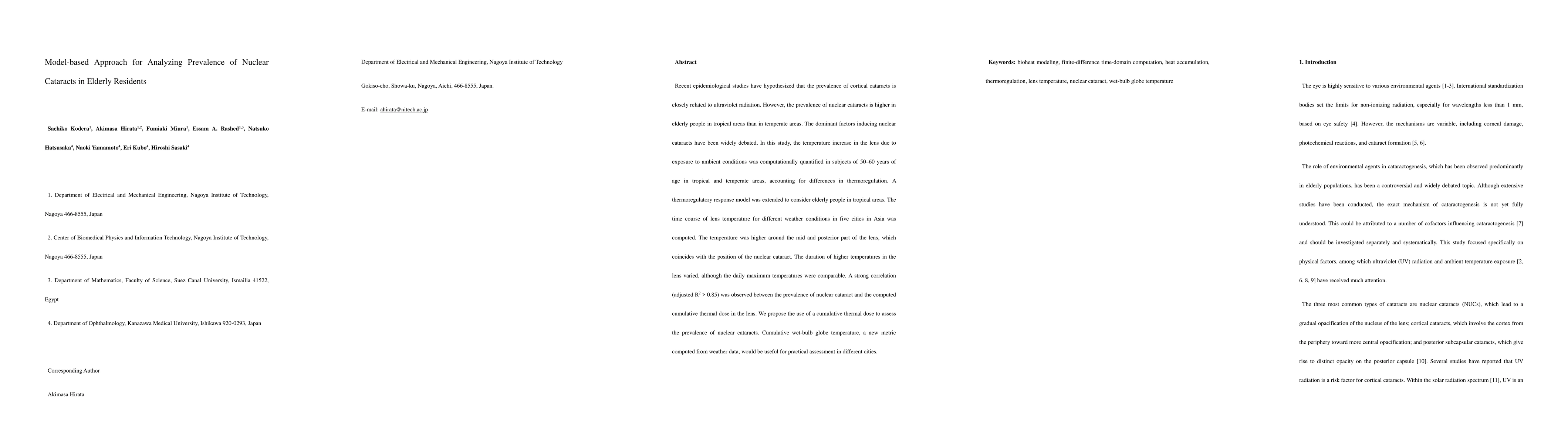 Recent epidemiological studies have hypothesized that the prevalence of cortical cataracts is closely related to ultraviolet radiation. However, the prevalence of nuclear cataracts is higher in elderly people in tropical areas than in temperate areas. The dominant factors inducing nuclear cataracts have been widely debated. In this study, the temperature increase in the lens due to exposure to ambient conditions was computationally quantified in subjects of 50-60 years of age in tropical and temperate areas, accounting for differences in thermoregulation. A thermoregulatory response model was extended to consider elderly people in tropical areas. The time course of lens temperature for different weather conditions in five cities in Asia was computed. The temperature was higher around the mid and posterior part of the lens, which coincides with the position of the nuclear cataract. The duration of higher temperatures in the lens varied, although the daily maximum temperatures were comparable. A strong correlation (adjusted R2 > 0.85) was observed between the prevalence of nuclear cataract and the computed cumulative thermal dose in the lens. We propose the use of a cumulative thermal dose to assess the prevalence of nuclear cataracts. Cumulative wet-bulb globe temperature, a new metric computed from weather data, would be useful for practical assessment in different cities.