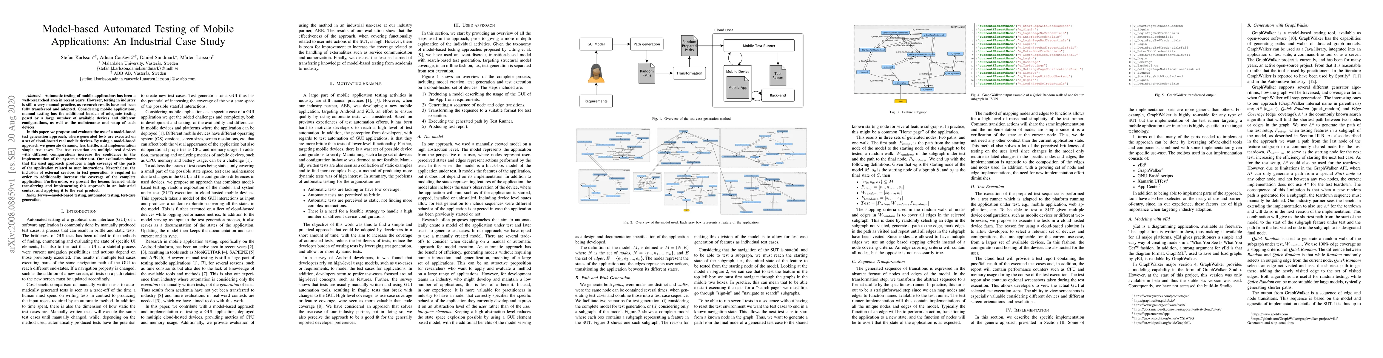 This paper proposes a model-based automated testing approach for mobile applications, executed on cloud-hosted real devices, to improve test coverage and reduce brittleness. The study highlights the challenges of manual testing in industry and demonstrates the effectiveness of the approach in an industrial context.