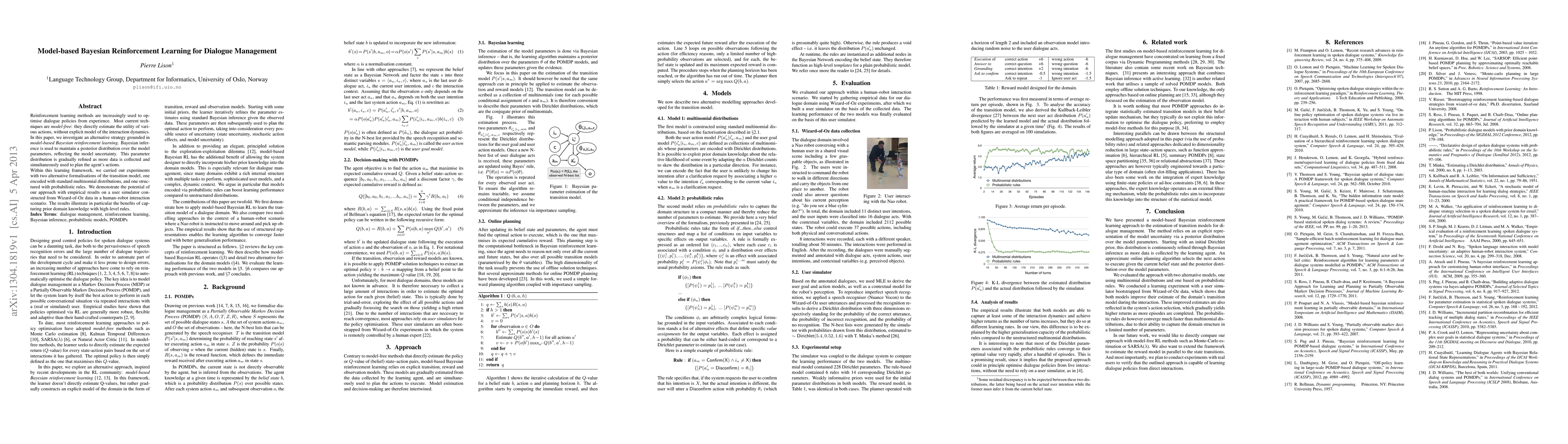 This paper explores model-based Bayesian reinforcement learning for dialogue management, contrasting it with model-free methods. It employs Bayesian inference to refine a posterior distribution over model parameters, which is used to plan actions, and tests two transition model formalisations, showing benefits from incorporating domain knowledge via high-level rules.