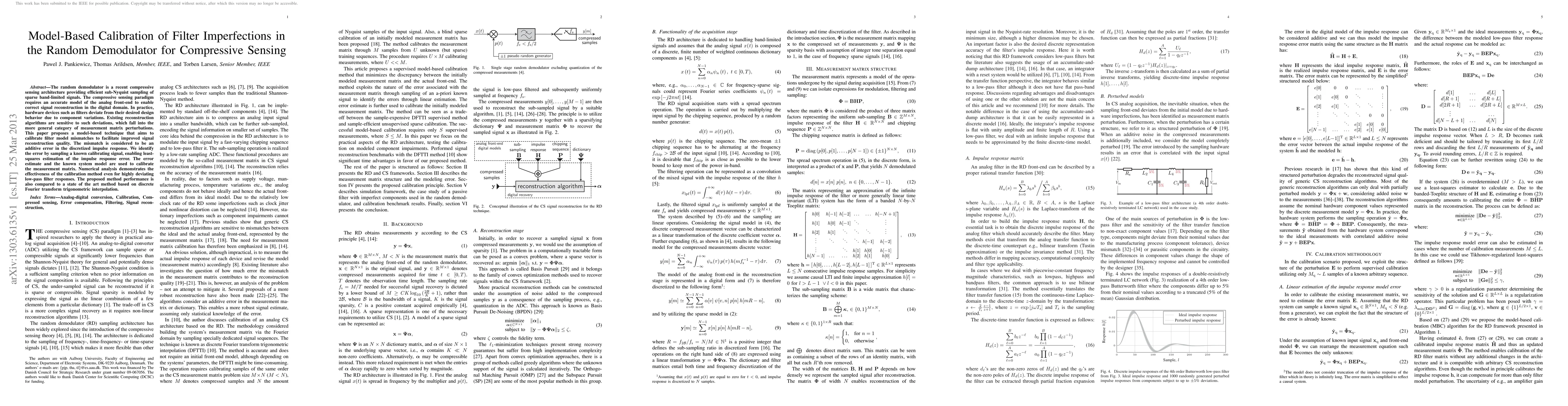 This paper proposes a model-based calibration technique to improve signal reconstruction quality in compressive sensing by correcting filter imperfections. The method estimates the error in the filter's impulse response and uses it to calibrate the measurement matrix.
