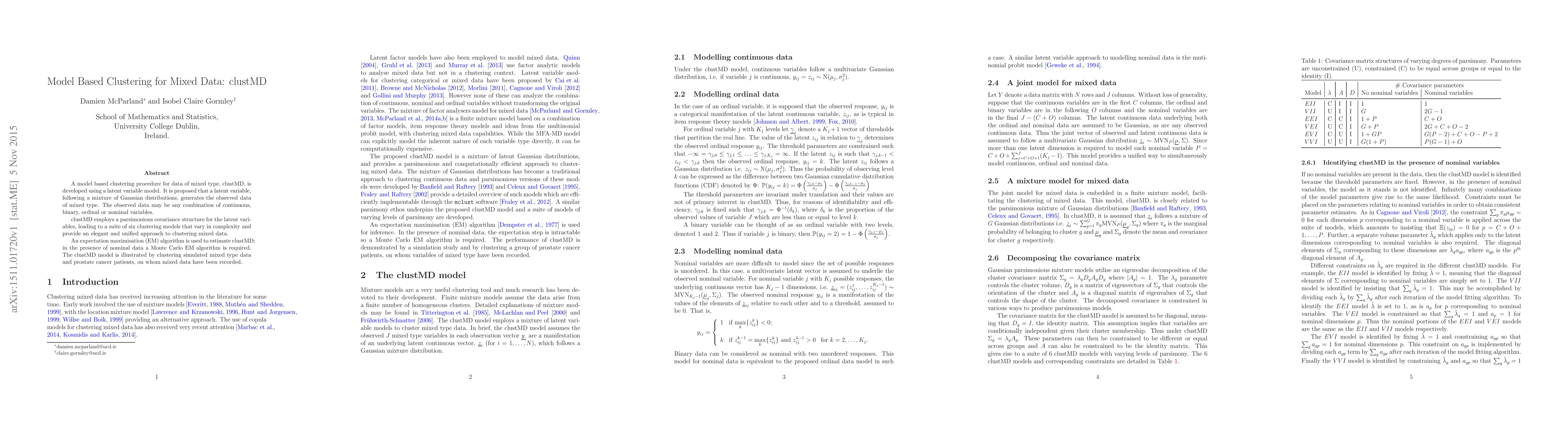 The clustMD model is a model-based clustering procedure for mixed data types using latent variables and a mixture of Gaussian distributions. It employs an EM algorithm for estimation, with a Monte Carlo EM for nominal data, and demonstrates clustering on simulated data and prostate cancer patients.