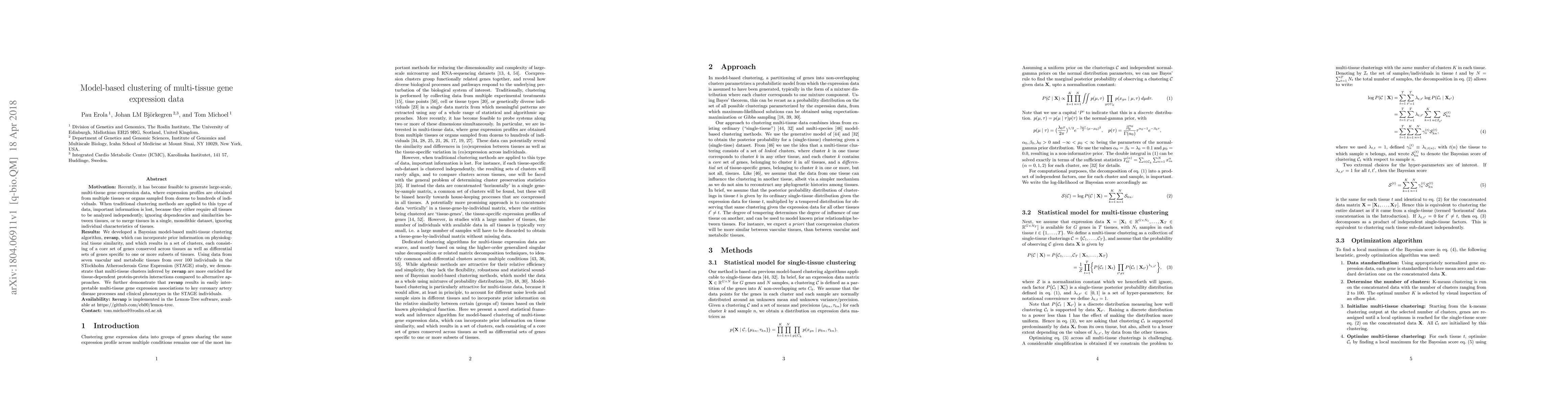 Recently, it has become feasible to generate large-scale, multi-tissue gene expression data, where expression profiles are obtained from multiple tissues or organs sampled from dozens to hundreds of individuals. When traditional clustering methods are applied to this type of data, important information is lost, because they either require all tissues to be analyzed independently, ignoring dependencies and similarities between tissues, or to merge tissues in a single, monolithic dataset, ignoring individual characteristics of tissues. We developed a Bayesian model-based multi-tissue clustering algorithm, revamp, which can incorporate prior information on physiological tissue similarity, and which results in a set of clusters, each consisting of a core set of genes conserved across tissues as well as differential sets of genes specific to one or more subsets of tissues. Using data from seven vascular and metabolic tissues from over 100 individuals in the STockholm Atherosclerosis Gene Expression (STAGE) study, we demonstrate that multi-tissue clusters inferred by revamp are more enriched for tissue-dependent protein-protein interactions compared to alternative approaches. We further demonstrate that revamp results in easily interpretable multi-tissue gene expression associations to key coronary artery disease processes and clinical phenotypes in the STAGE individuals. Revamp is implemented in the Lemon-Tree software, available at https://github.com/eb00/lemon-tree