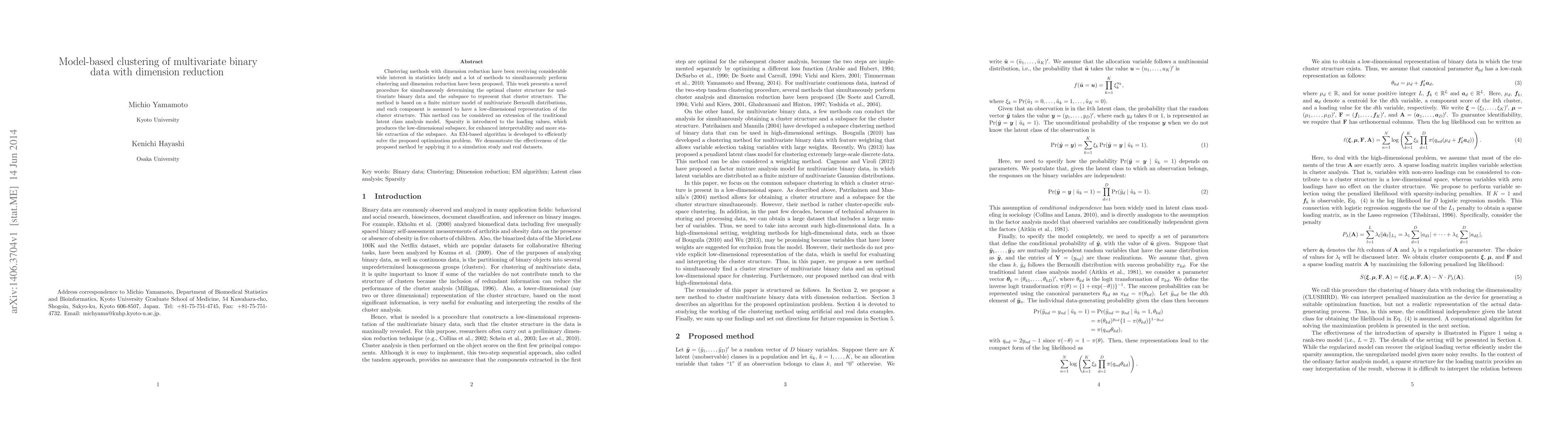 This paper introduces a novel clustering method for multivariate binary data that combines dimension reduction with a finite mixture model of Bernoulli distributions. The method employs sparsity to enhance interpretability and stability, using an EM algorithm to solve the optimization problem, and is demonstrated through simulations and real-world data applications.