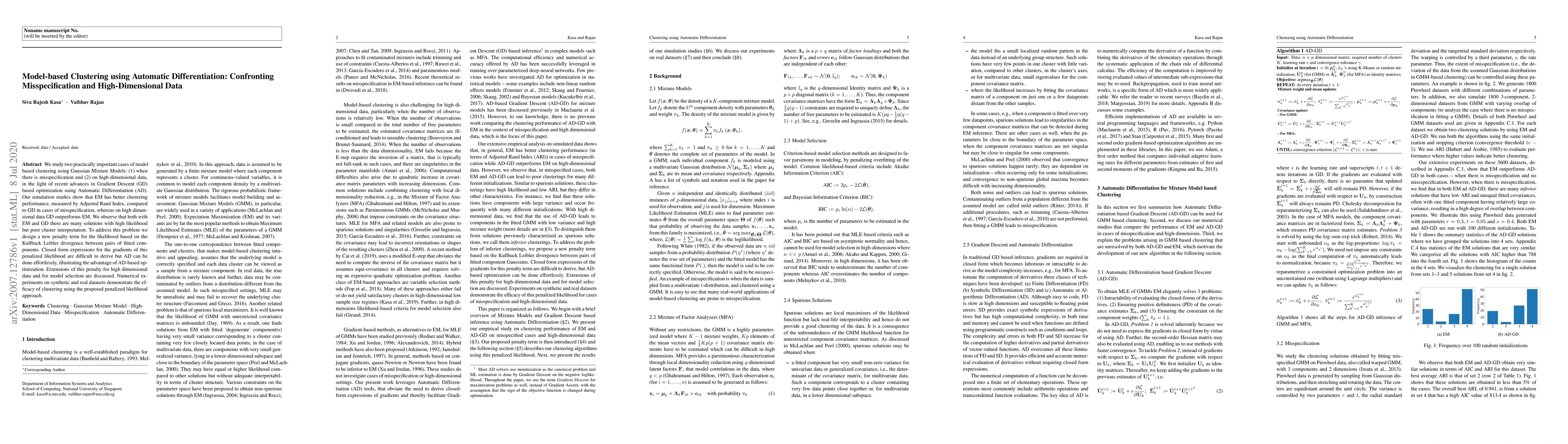 This paper investigates model-based clustering with Gaussian Mixture Models under misspecification and high-dimensional data, using Automatic Differentiation for optimization. It finds that the Expectation-Maximization algorithm outperforms Gradient Descent in misspecified cases, while Gradient Descent excels in high dimensions. The authors propose a new penalized likelihood with a Kullback-Leibler divergence penalty, optimized via Automatic Differentiation, which improves clustering performance.