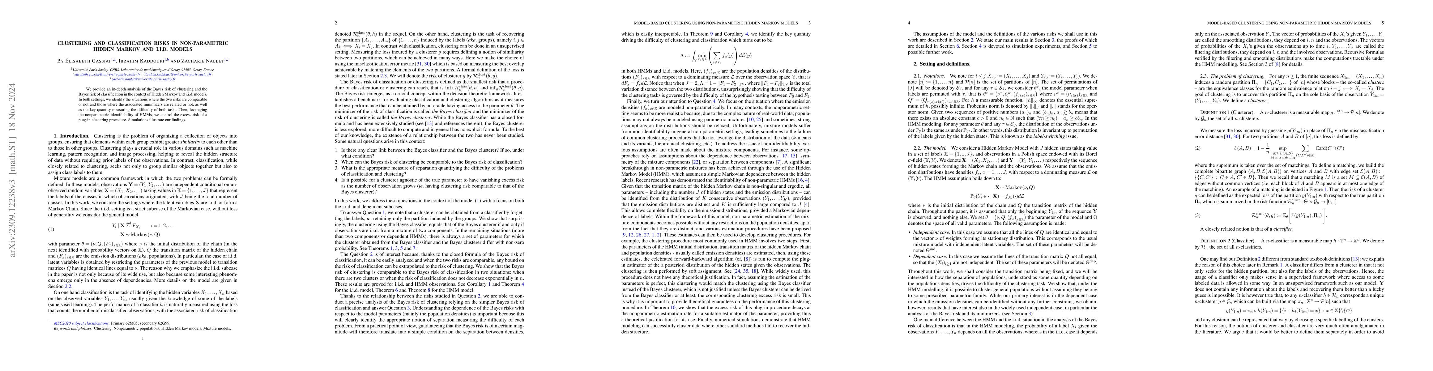 This paper explores model-based clustering using non-parametric Hidden Markov Models (HMMs), establishing a link between the Bayes risk of classification and clustering. It proposes clustering procedures and demonstrates their validity in both i.i.d. and online settings through simulations.