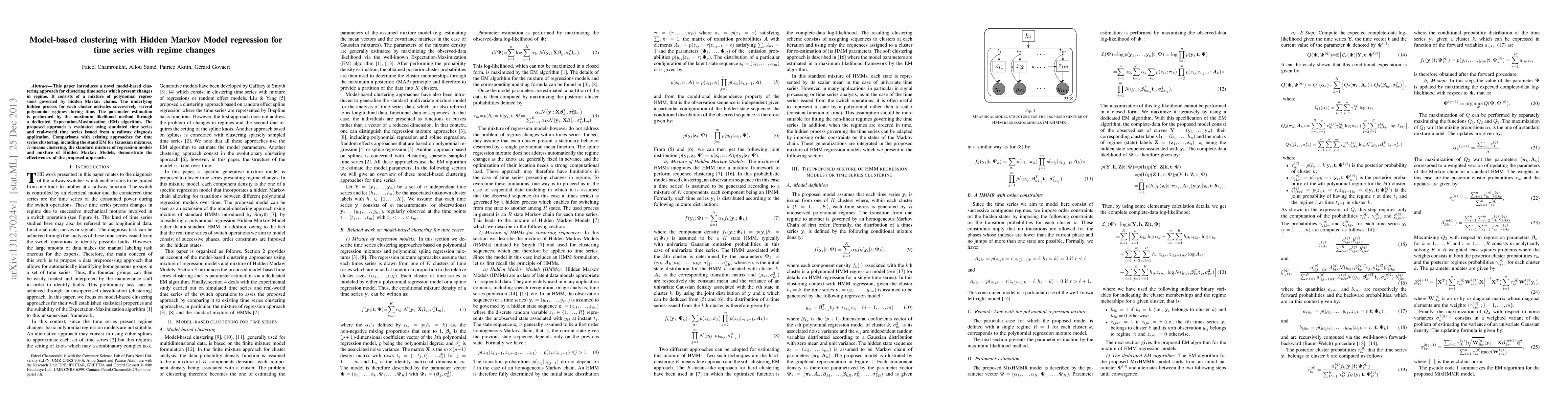 This paper proposes a novel model-based clustering method for time series with regime changes, using a mixture of polynomial regressions governed by hidden Markov chains. The approach is evaluated against existing methods, showing its effectiveness through simulations and a railway diagnosis application.