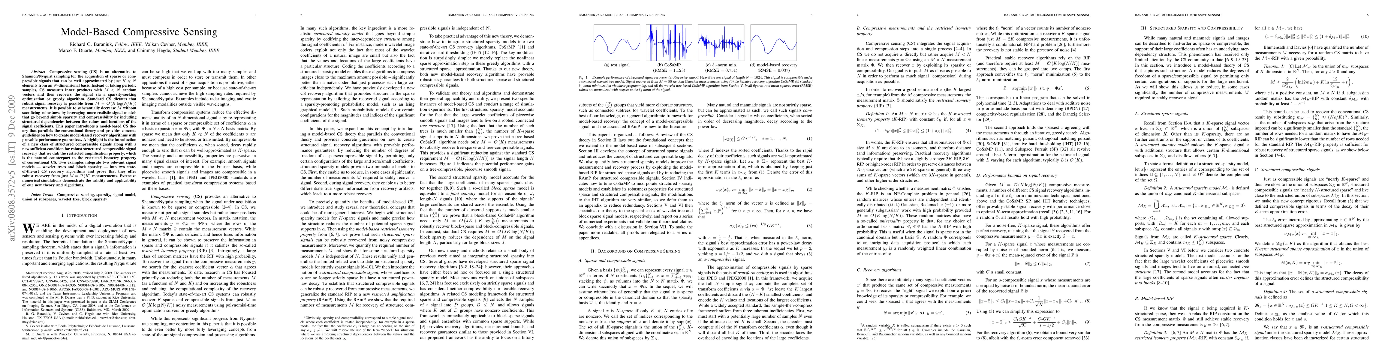 This paper introduces a model-based compressive sensing theory that provides guidelines for robust signal recovery from sparse or compressible signals with improved performance guarantees.