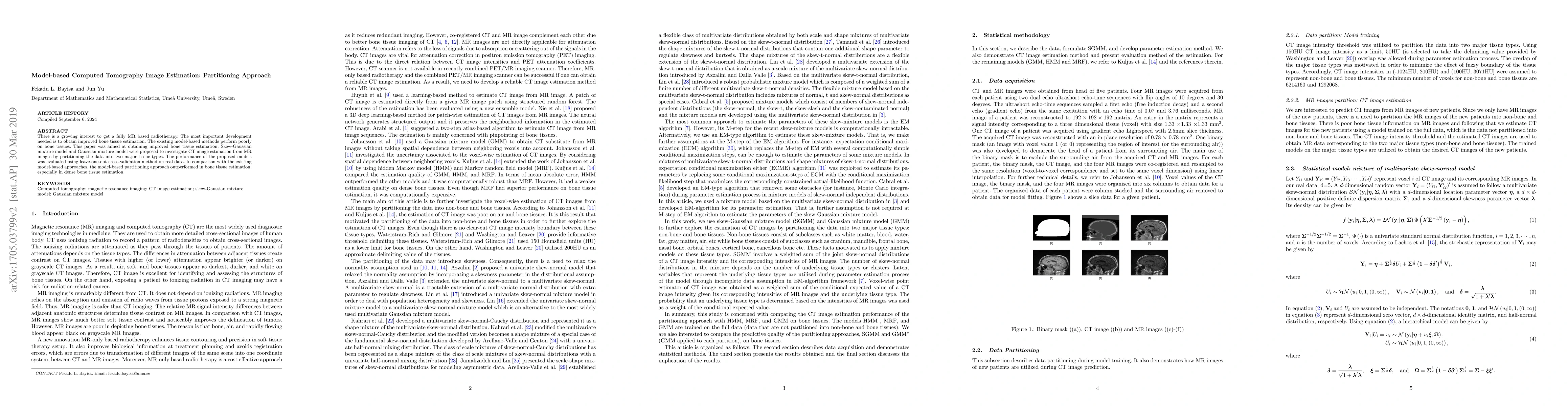 There is a growing interest to get a fully MR based radiotherapy. The most important development needed is to obtain improved bone tissue estimation. The existing model-based methods perform poorly on bone tissues. This paper was aimed at obtaining improved bone tissue estimation. Skew Gaussian mixture model and Gaussian mixture model were proposed to investigate CT image estimation from MR images by partitioning the data into two major tissue types. The performance of the proposed models was evaluated using leave-one-out cross-validation method on real data. In comparison with the existing model-based approaches, the model-based partitioning approach outperformed in bone tissue estimation, especially in dense bone tissue estimation.