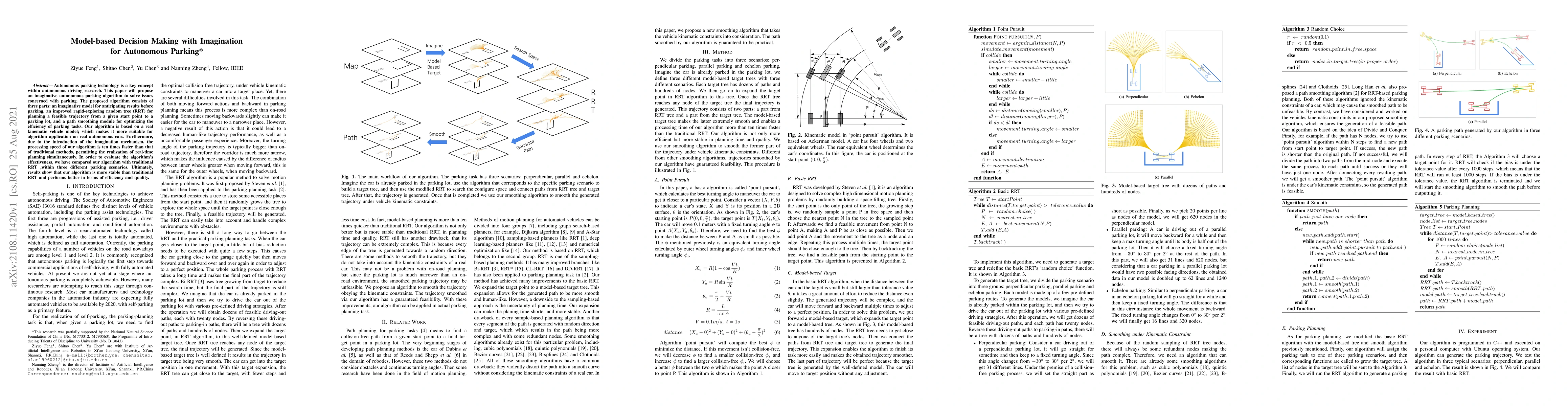 Autonomous parking technology is a key concept within autonomous driving research. This paper will propose an imaginative autonomous parking algorithm to solve issues concerned with parking. The proposed algorithm consists of three parts: an imaginative model for anticipating results before parking, an improved rapid-exploring random tree (RRT) for planning a feasible trajectory from a given start point to a parking lot, and a path smoothing module for optimizing the efficiency of parking tasks. Our algorithm is based on a real kinematic vehicle model; which makes it more suitable for algorithm application on real autonomous cars. Furthermore, due to the introduction of the imagination mechanism, the processing speed of our algorithm is ten times faster than that of traditional methods, permitting the realization of real-time planning simultaneously. In order to evaluate the algorithm's effectiveness, we have compared our algorithm with traditional RRT, within three different parking scenarios. Ultimately, results show that our algorithm is more stable than traditional RRT and performs better in terms of efficiency and quality.