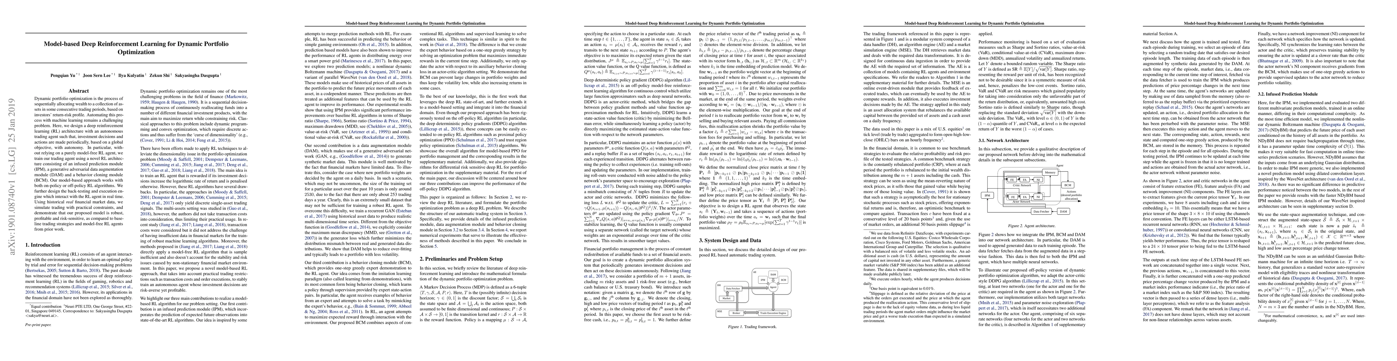 This paper proposes a model-based deep reinforcement learning architecture for dynamic portfolio optimization, integrating a prediction module, data augmentation, and behavior cloning. The approach demonstrates robustness, profitability, and risk-sensitivity using real financial market data, outperforming baseline strategies and model-free RL agents.