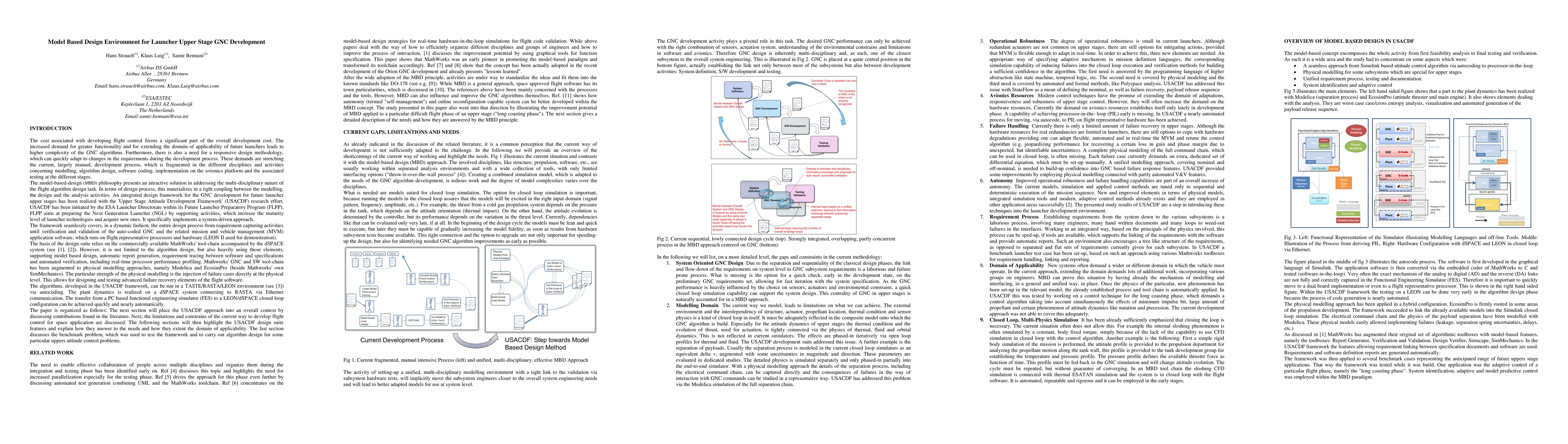 The cost associated with developing flight control forms a significant part of the overall development cost. The increased demand for greater functionality and for extending the domain of applicability of future launchers leads to higher complexity of the GNC algorithms. Furthermore, there is also a need for a responsive design methodology, which can quickly adapt to changes in the requirements during the development process. These demands are stretching the current,largely manual, development process, which is fragmented in the different disciplines and activities concerning modelling, algorithm design, software coding, implementation on the avionics platform and the associated testing at the different stages. The model-based-design (MBD) philosophy presents an attractive solution in addressing the multi-disciplinary nature of the flight algorithm design task. In terms of design process, this materializes in a tight coupling between the modelling, the design and the analysis activities.An integrated design framework for the GNC development for future launcher upper stages has been realized.