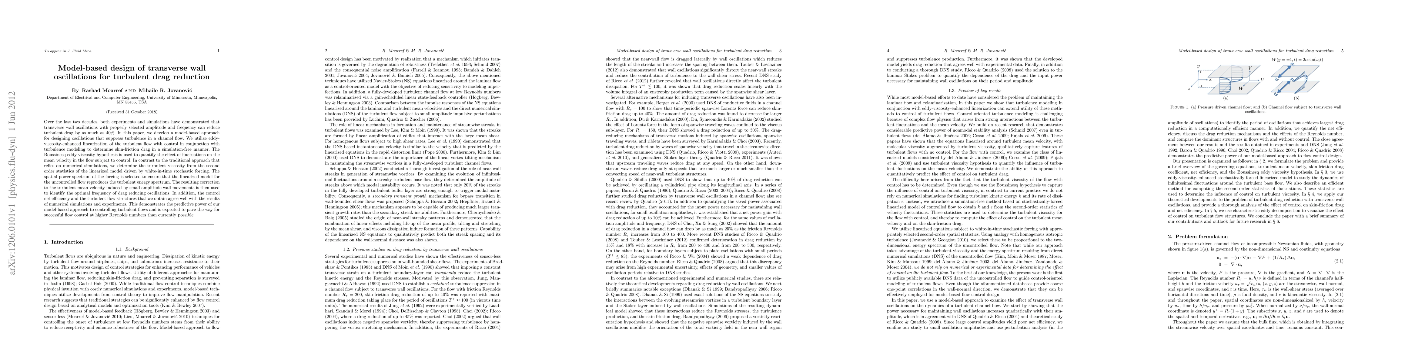 Over the last two decades, both experiments and simulations have demonstrated that transverse wall oscillations with properly selected amplitude and frequency can reduce turbulent drag by as much as 40%. In this paper, we develop a model-based approach for designing oscillations that suppress turbulence in a channel flow. We utilize eddy-viscosity-enhanced linearization of the turbulent flow with control in conjunction with turbulence modeling to determine skin-friction drag in a simulation-free manner. The Boussinesq eddy viscosity hypothesis is used to quantify the effect of fluctuations on the mean velocity in the flow subject to control. In contrast to the traditional approach that relies on numerical simulations, we determine the turbulent viscosity from the second order statistics of the linearized model driven by white-in-time stochastic forcing. The spatial power spectrum of the forcing is selected to ensure that the linearized model for the uncontrolled flow reproduces the turbulent energy spectrum. The resulting correction to the turbulent mean velocity induced by small amplitude wall movements is then used to identify the optimal frequency of drag reducing oscillations. In addition, the control net efficiency and the turbulent flow structures that we obtain agree well with the results of numerical simulations and experiments. This demonstrates the predictive power of our model-based approach to controlling turbulent flows and is expected to pave the way for successful flow control at higher Reynolds numbers than currently possible.