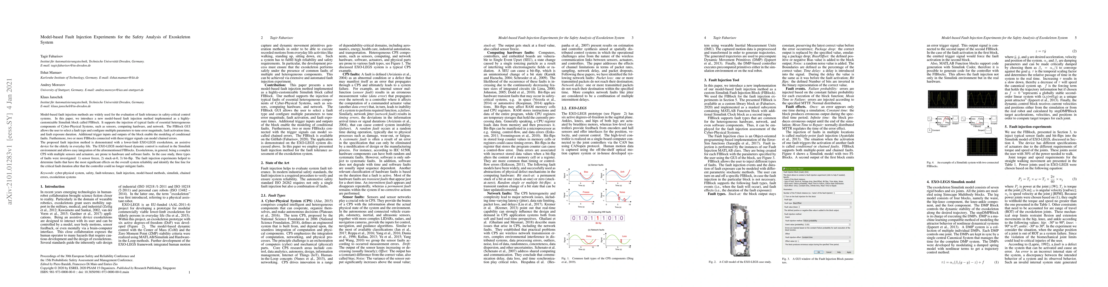 Model-based fault injection methods are widely used for the evaluation of fault tolerance in safety-critical control systems. In this paper, we introduce a new model-based fault injection method implemented as a highlycustomizable Simulink block called FIBlock. It supports the injection of typical faults of essential heterogeneous components of Cyber-Physical Systems, such as sensors, computing hardware, and network. The FIBlock GUI allows the user to select a fault type and configure multiple parameters to tune error magnitude, fault activation time, and fault exposure duration. Additional trigger inputs and outputs of the block enable the modeling of conditional faults. Furthermore, two or more FIBlocks connected with these trigger signals can model chained errors. The proposed fault injection method is demonstrated with a lower-limb EXO-LEGS exoskeleton, an assistive device for the elderly in everyday life. The EXO-LEGS model-based dynamic control is realized in the Simulink environment and allows easy integration of the aforementioned FIBlocks. Exoskeletons, in general, being a complex CPS with multiple sensors and actuators, are prone to hardware and software faults. In the case study, three types of faults were investigated: 1) sensor freeze, 2) stuck-at-0, 3) bit-flip. The fault injection experiments helped to determine faults that have the most significant effects on the overall system reliability and identify the fine line for the critical fault duration after that the controller could no longer mitigate faults.