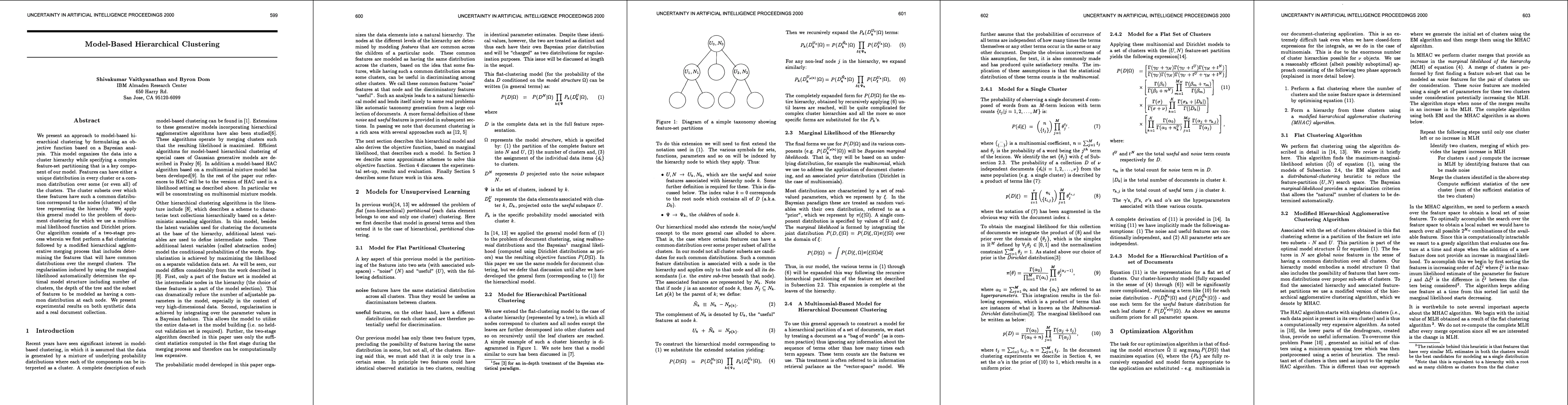This paper presents a Bayesian model-based hierarchical clustering approach that organizes data into a cluster hierarchy, allowing features to have unique or common distributions across clusters. The method uses a two-stage process for document clustering and determines optimal model structure through regularization. Experimental results on synthetic and real data demonstrate its effectiveness.