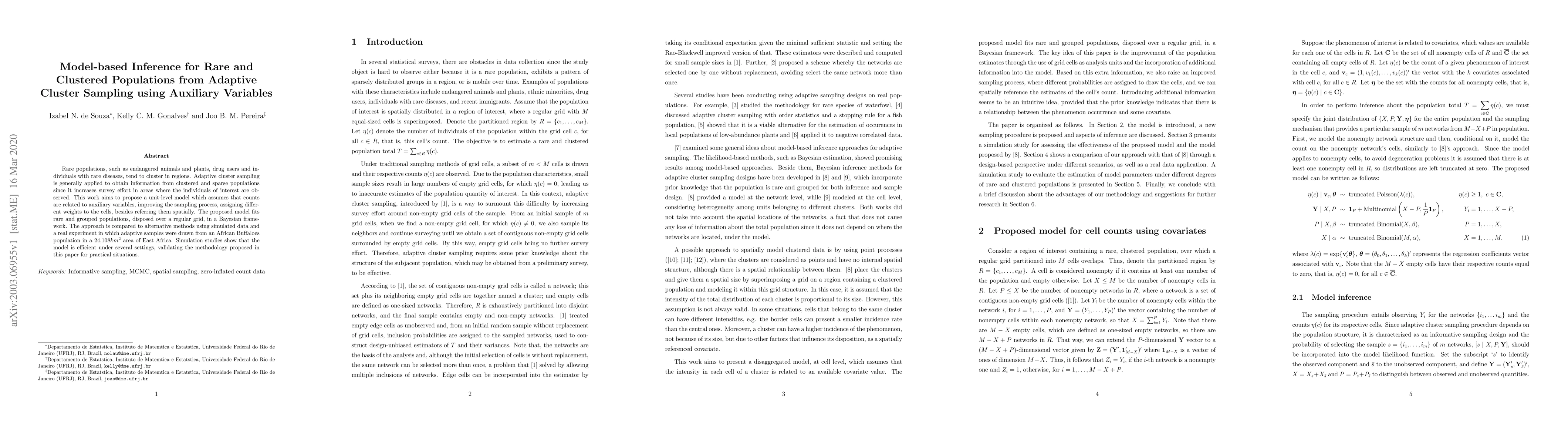 Rare populations, such as endangered animals and plants, drug users and individuals with rare diseases, tend to cluster in regions. Adaptive cluster sampling is generally applied to obtain information from clustered and sparse populations since it increases survey effort in areas where the individuals of interest are observed. This work aims to propose a unit-level model which assumes that counts are related to auxiliary variables, improving the sampling process, assigning different weights to the cells, besides referring them spatially. The proposed model fits rare and grouped populations, disposed over a regular grid, in a Bayesian framework. The approach is compared to alternative methods using simulated data and a real experiment in which adaptive samples were drawn from an African Buffaloes population in a 24,108 square kilometers area of East Africa. Simulation studies show that the model is efficient under several settings, validating the methodology proposed in this paper for practical situations.