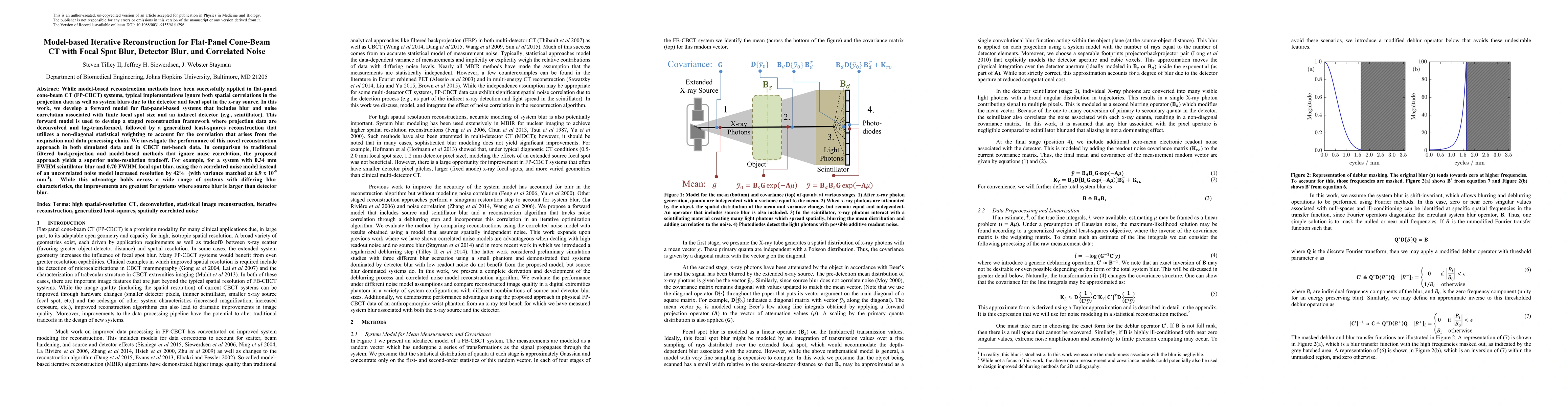 This paper proposes a model-based iterative reconstruction method for flat-panel cone-beam CT that incorporates focal spot and detector blur, as well as correlated noise. The method improves the noise-resolution tradeoff significantly compared to traditional methods, achieving a 42% increase in resolution for systems with larger source blur.