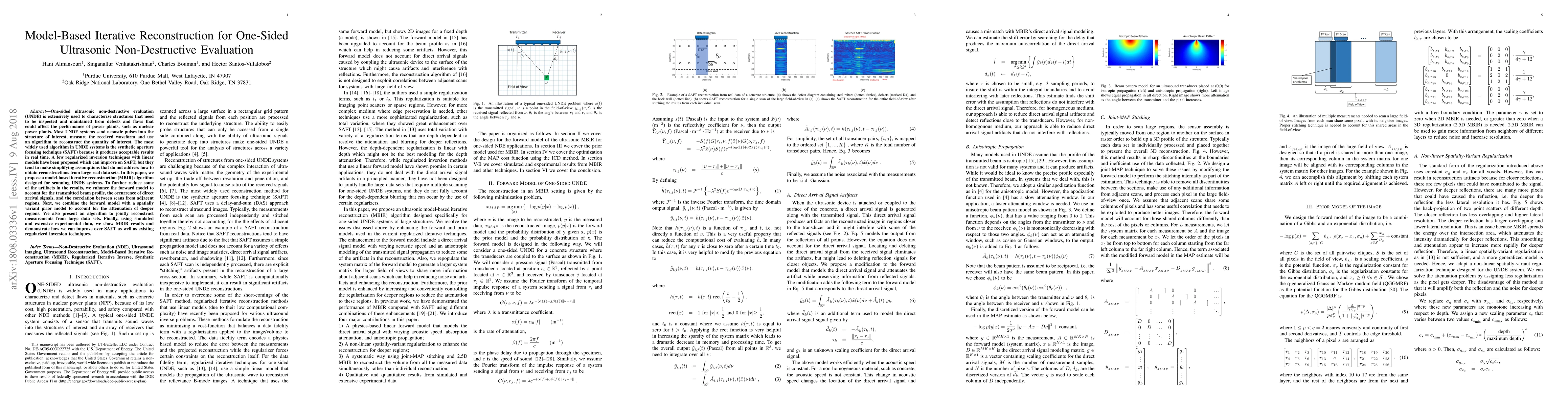 One-sided ultrasonic non-destructive evaluation (UNDE) is extensively used to characterize structures that need to be inspected and maintained from defects and flaws that could affect the performance of power plants, such as nuclear power plants. Most UNDE systems send acoustic pulses into the structure of interest, measure the received waveform and use an algorithm to reconstruct the quantity of interest. The most widely used algorithm in UNDE systems is the synthetic aperture focusing technique (SAFT) because it produces acceptable results in real time. A few regularized inversion techniques with linear models have been proposed which can improve on SAFT, but they tend to make simplifying assumptions that do not address how to obtain reconstructions from large real data sets. In this paper, we propose a model-based iterative reconstruction (MBIR) algorithm designed for scanning UNDE systems. To further reduce some of the artifacts in the results, we enhance the forward model to account for the transmitted beam profile, the occurrence of direct arrival signals, and the correlation between scans from adjacent regions. Next, we combine the forward model with a spatially variant prior model to account for the attenuation of deeper regions. We also present an algorithm to jointly reconstruct measurements from large data sets. Finally, using simulated and extensive experimental data, we show MBIR results and demonstrate how we can improve over SAFT as well as existing regularized inversion techniques.