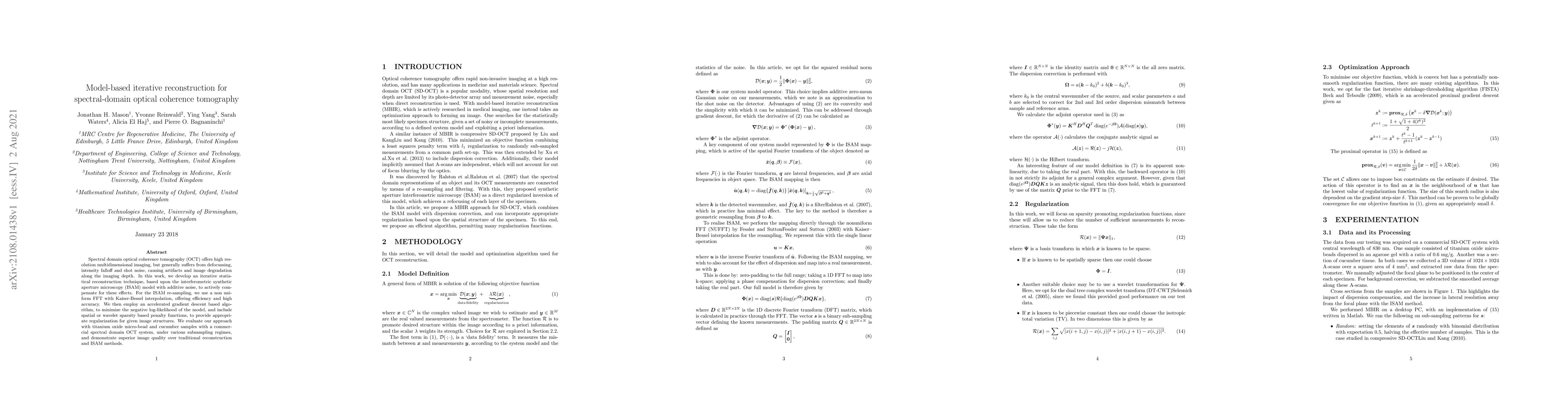 This paper proposes an iterative statistical reconstruction technique based on the ISAM model to improve spectral domain OCT imaging, addressing defocussing, intensity falloff, and shot noise. The method uses a non-uniform FFT and accelerated gradient descent with regularization to achieve superior image quality compared to traditional methods.