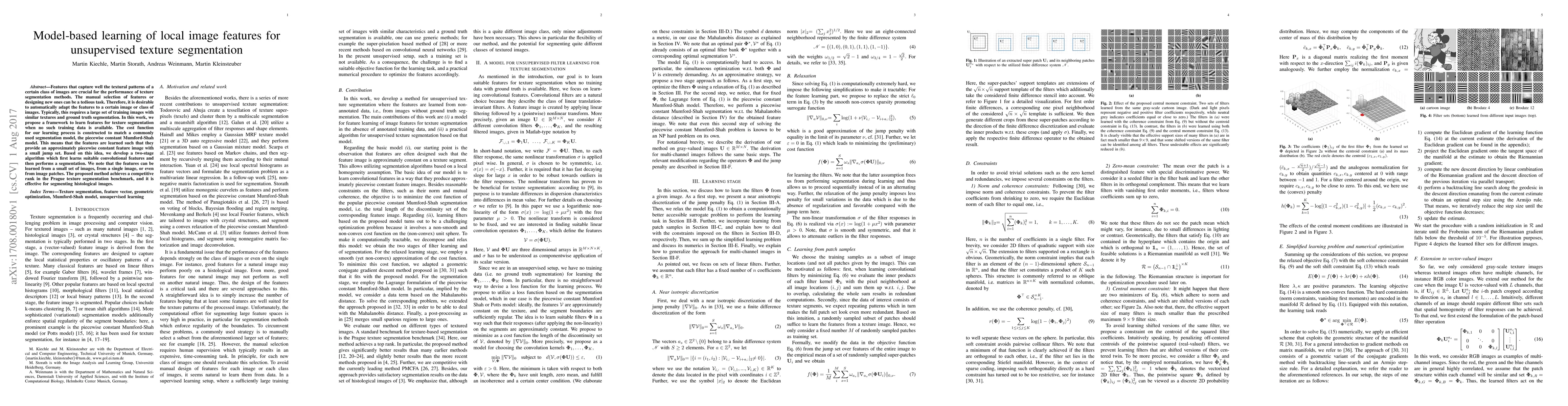 This paper proposes a framework for unsupervised learning of convolutional features for texture segmentation, using a cost function aligned with the Mumford-Shah model. The method can learn from minimal training data, achieving competitive results on the Prague texture segmentation benchmark and effectively segmenting histological images.