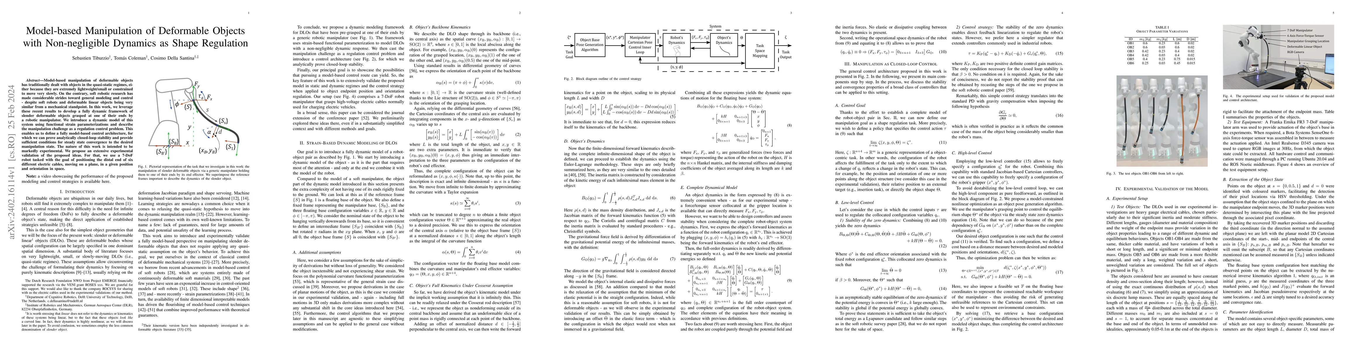 This paper develops a dynamic model-based framework for manipulating slender deformable objects, such as electric cables, using a robotic manipulator. It introduces a regulation control problem approach to ensure closed-loop stability and steady-state convergence, validated experimentally with a 7-DoF robot positioning cables.