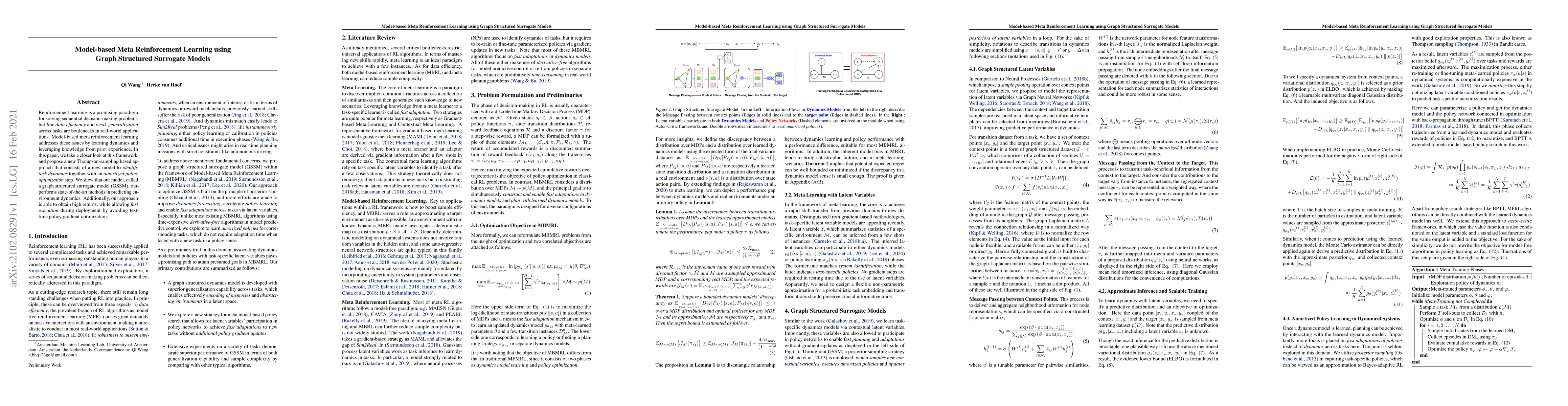 This paper proposes a Thompson-sampling based model-based meta reinforcement learning approach using a graph structured surrogate model (GSSM) to enhance data efficiency and generalization. The GSSM improves environment dynamics prediction and achieves high returns with fast deployment execution.