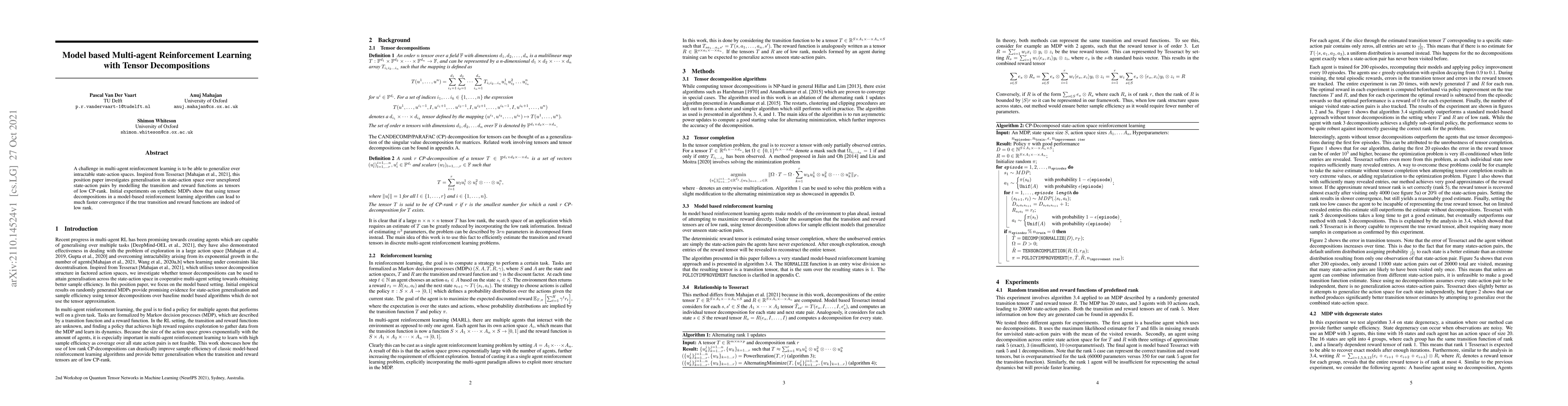 A challenge in multi-agent reinforcement learning is to be able to generalize over intractable state-action spaces. Inspired from Tesseract [Mahajan et al., 2021], this position paper investigates generalisation in state-action space over unexplored state-action pairs by modelling the transition and reward functions as tensors of low CP-rank. Initial experiments on synthetic MDPs show that using tensor decompositions in a model-based reinforcement learning algorithm can lead to much faster convergence if the true transition and reward functions are indeed of low rank.