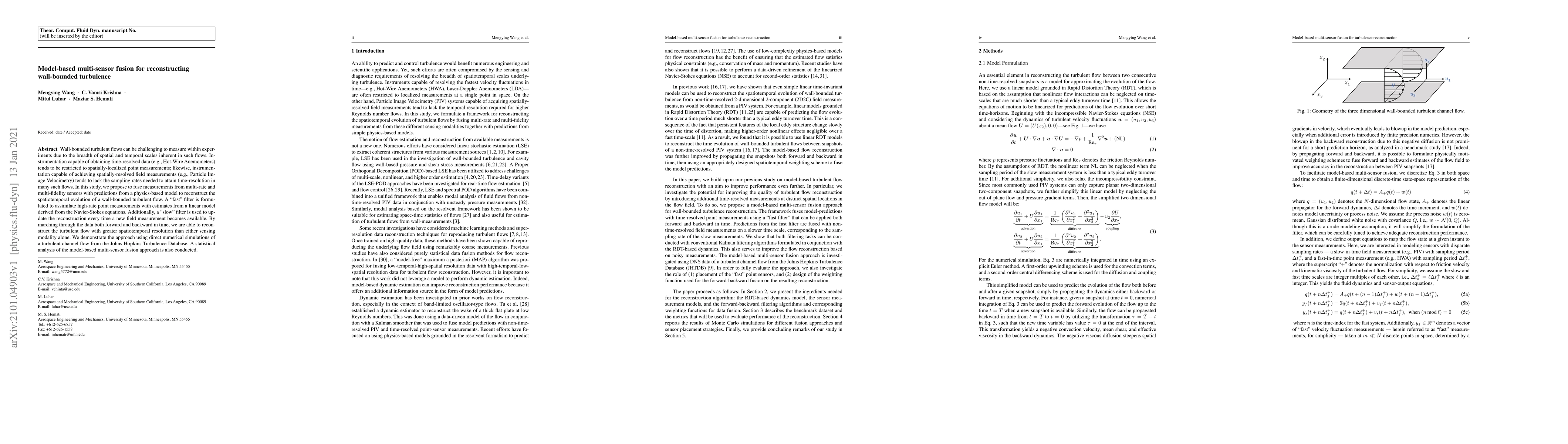 This study proposes a model-based fusion technique to reconstruct wall-bounded turbulence by integrating high-rate point measurements with spatially-resolved field data and physics-based model predictions. The method uses a "fast" filter for point measurements and a "slow" filter for field measurements to achieve enhanced spatiotemporal resolution.