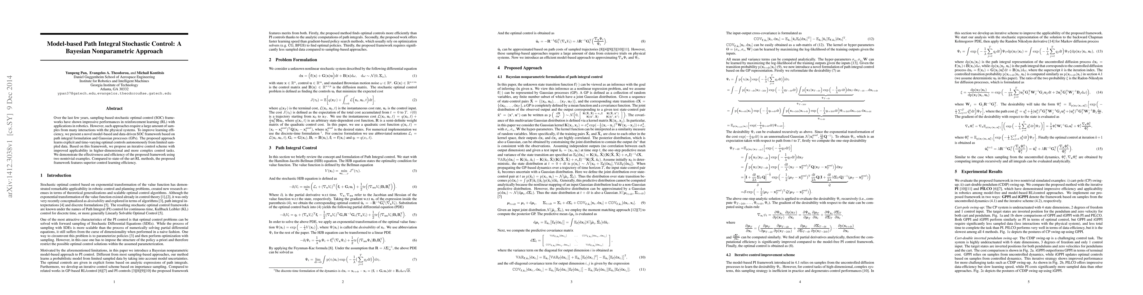 This paper introduces a novel model-based stochastic optimal control framework using path integral formulation and Gaussian processes to efficiently learn optimal controls from limited data. The proposed framework demonstrates improved efficiency and effectiveness in higher-dimensional control tasks compared to state-of-the-art reinforcement learning methods.