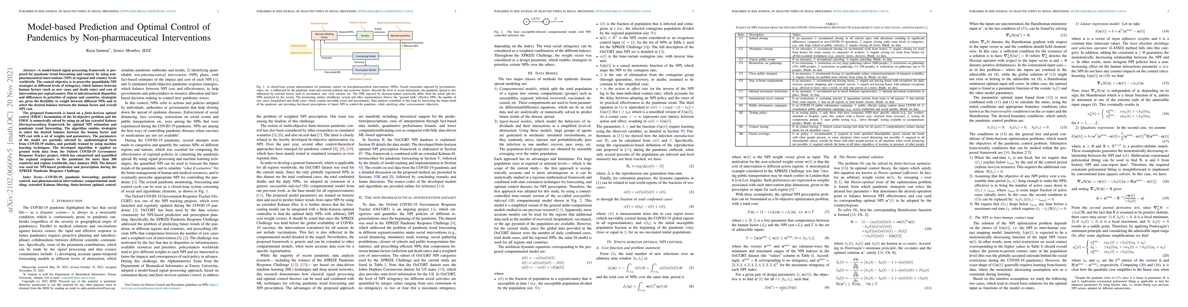 A model-based signal processing framework is proposed for pandemic trend forecasting and control, by using non-pharmaceutical interventions (NPI) at regional and country levels worldwide. The control objective is to prescribe quantifiable NPI strategies at different levels of stringency, which balance between human factors (such as new cases and death rates) and cost of intervention per region/country. Due to infrastructural disparities and differences in priorities of regions and countries, strategists are given the flexibility to weight between different NPIs and to select the desired balance between the human factor and overall NPI cost. The proposed framework is based on a \textit{finite-horizon optimal control} (FHOC) formulation of the bi-objective problem and the FHOC is numerically solved by using an ad hoc \textit{extended Kalman filtering/smoothing} framework for optimal NPI estimation and pandemic trend forecasting. The algorithm enables strategists to select the desired balance between the human factor and NPI cost with a set of weights and parameters. The parameters of the model are partially selected by epidemiological facts from COVID-19 studies, and partially trained by using machine learning techniques. The developed algorithm is applied on ground truth data from the Oxford COVID-19 Government Response Tracker project, which has categorized and quantified the regional responses to the pandemic for more than 300 countries and regions worldwide, since January 2020. The dataset was used for NPI-based prediction and prescription during the XPRIZE Pandemic Response Challenge.