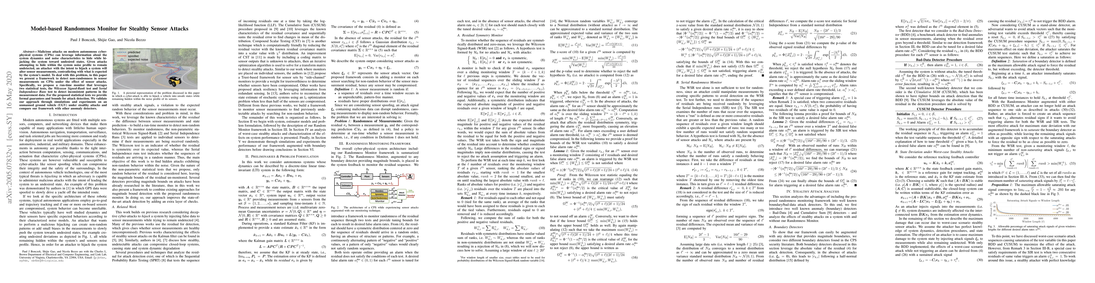This paper proposes a model-based randomness monitor to detect stealthy sensor attacks on cyber-physical systems by identifying non-random patterns in sensor measurements using statistical tests. The Wilcoxon Signed-Rank test and Serial Independence Runs test are validated through simulations and experiments on an unmanned ground vehicle, demonstrating effective detection of inconsistent measurement data.