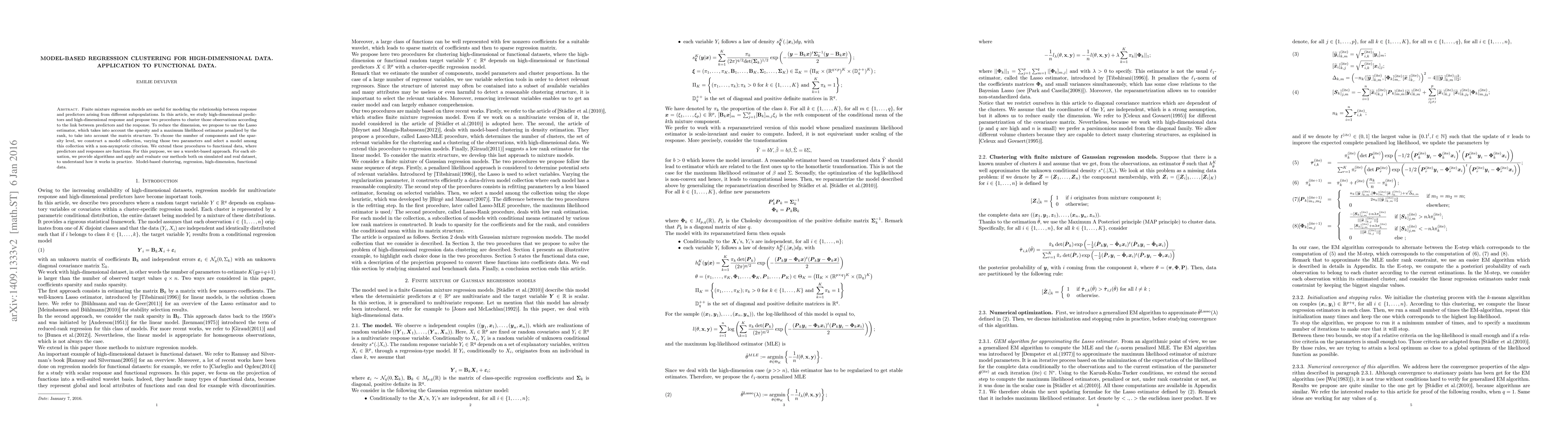 Finite mixture regression models are useful for modeling the relationship between response and predictors, arising from different subpopulations. In this article, we study high-dimensional predic- tors and high-dimensional response, and propose two procedures to deal with this issue. We propose to use the Lasso estimator to take into account the sparsity, and a penalty on the rank, to take into account the matrix structure. Then, we extend these procedures to the functional case, where predictors and responses are functions. For this purpose, we use a wavelet-based approach. Finally, for each situation, we provide algorithms, and apply and evaluate our methods both on simulations and real datasets.