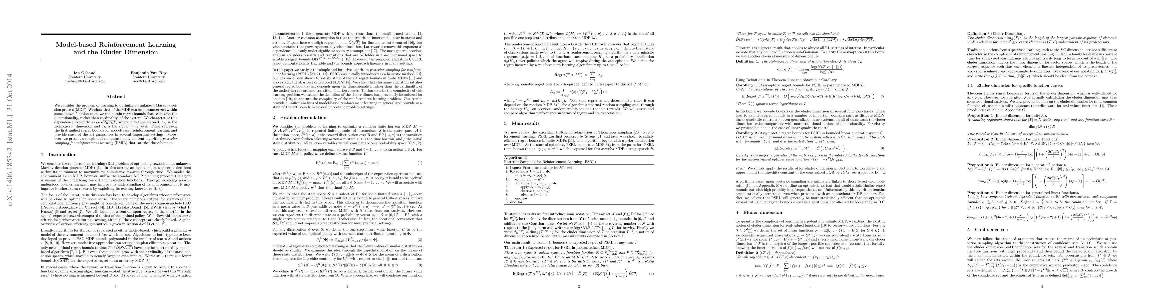 We consider the problem of learning to optimize an unknown Markov decision process (MDP). We show that, if the MDP can be parameterized within some known function class, we can obtain regret bounds that scale with the dimensionality, rather than cardinality, of the system. We characterize this dependence explicitly as $\tilde{O}(\sqrt{d_K d_E T})$ where $T$ is time elapsed, $d_K$ is the Kolmogorov dimension and $d_E$ is the \emph{eluder dimension}. These represent the first unified regret bounds for model-based reinforcement learning and provide state of the art guarantees in several important settings. Moreover, we present a simple and computationally efficient algorithm \emph{posterior sampling for reinforcement learning} (PSRL) that satisfies these bounds.